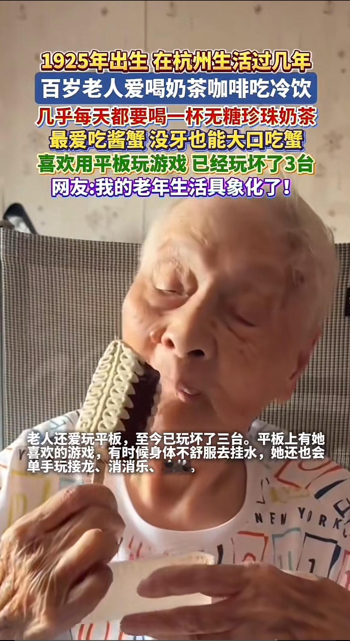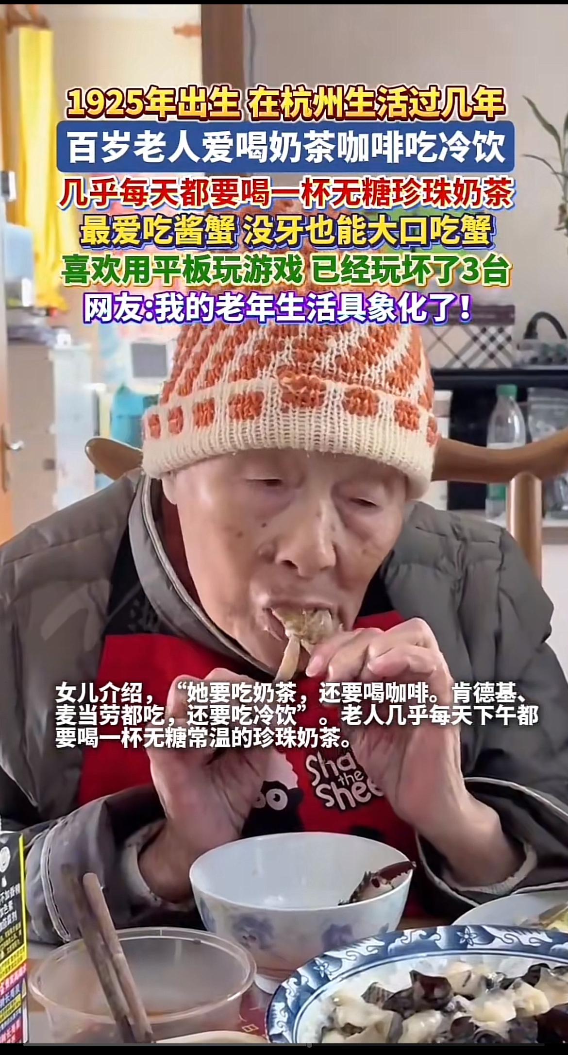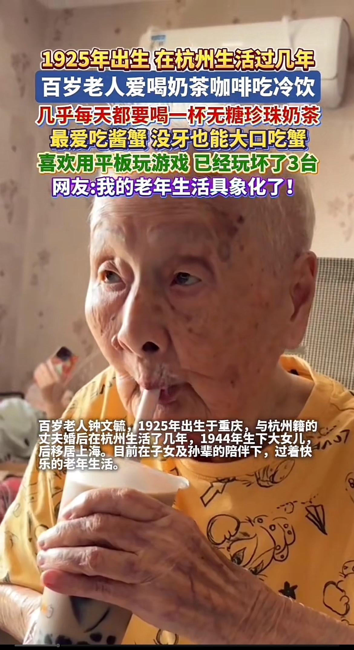 家人们,有个百岁老人的生活日常太让人惊掉下巴了!这老人奶茶、咖啡、冷饮样样都来,
