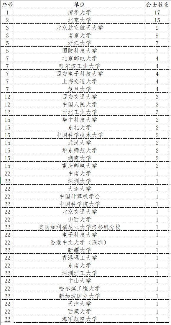高校计算机专业师资力量如何?看一看中国计算机学会(CCF)会士数量就知道了。 近日,中国计算机学会更新了2025年会士名单,5名院士晋升为CCF会士(具体名单见图一)。CCF会士是一种荣誉,经至少3名CCF杰出会员或会士(其中会士不少于两人)推荐、经会士评选委员会审核通过后方可成为CCF会士。 CCF会士自2008年首评以来,至今已拥有199名会士。这些会士大部分来自高校(大部分来自国内院校,也有少部分国外高校),也有部分来自研究所和企业。想成为会士,必须在计算机及相关领域有重大发明创造及有重要贡献、或对计算机学会发展有重要贡献。所以,一所院校会士的多少,直接体现出这所院校在本领域内的师资力量。 在CCF数量排名上,至现在为止,清华、北大断崖式领先,北京航空航天大学、南京大学和浙江大学、国防科技大学也有不俗的表现。