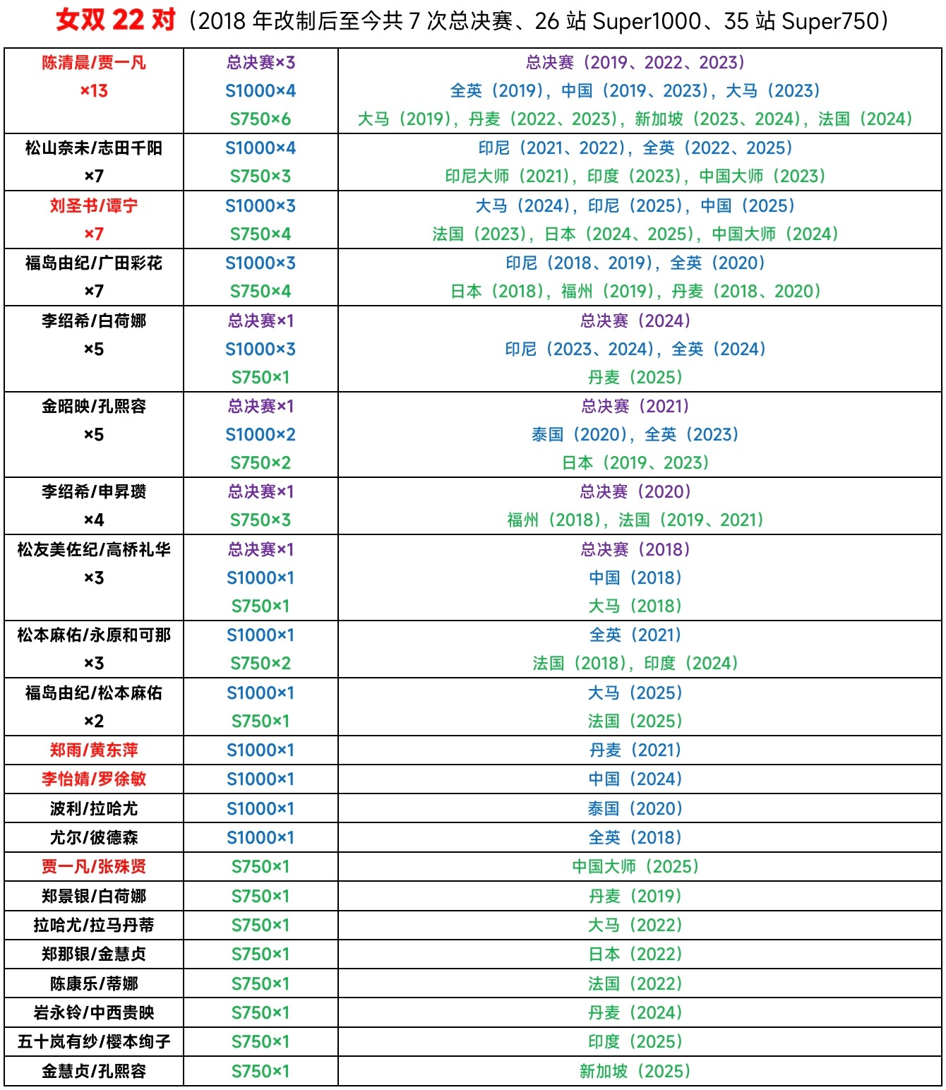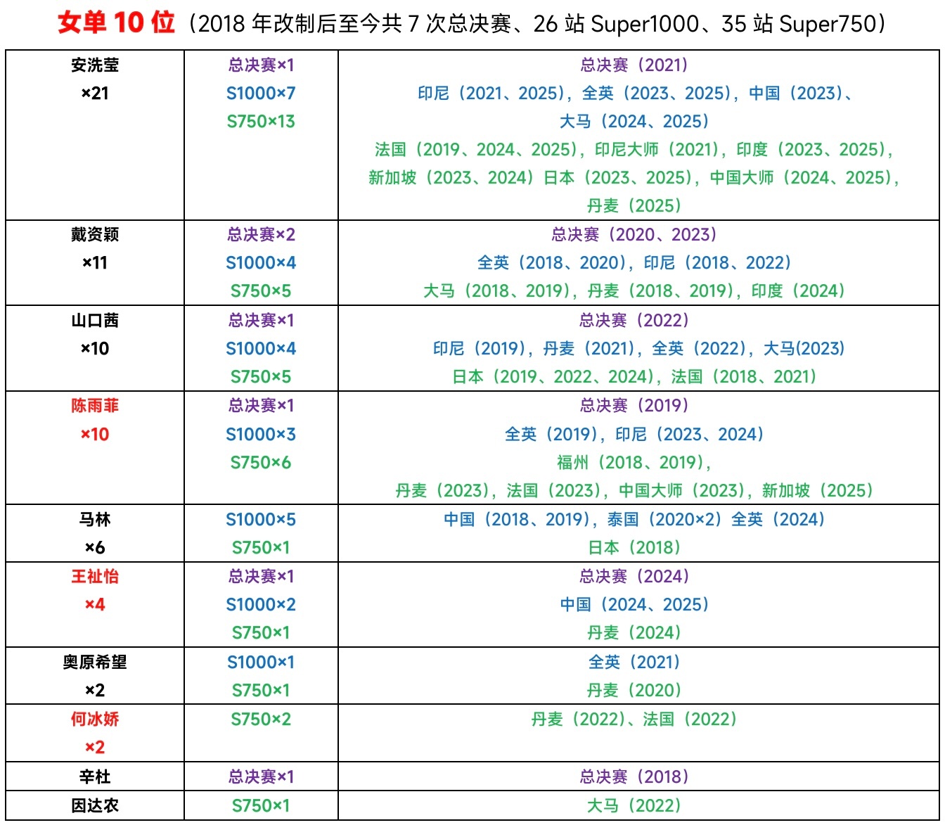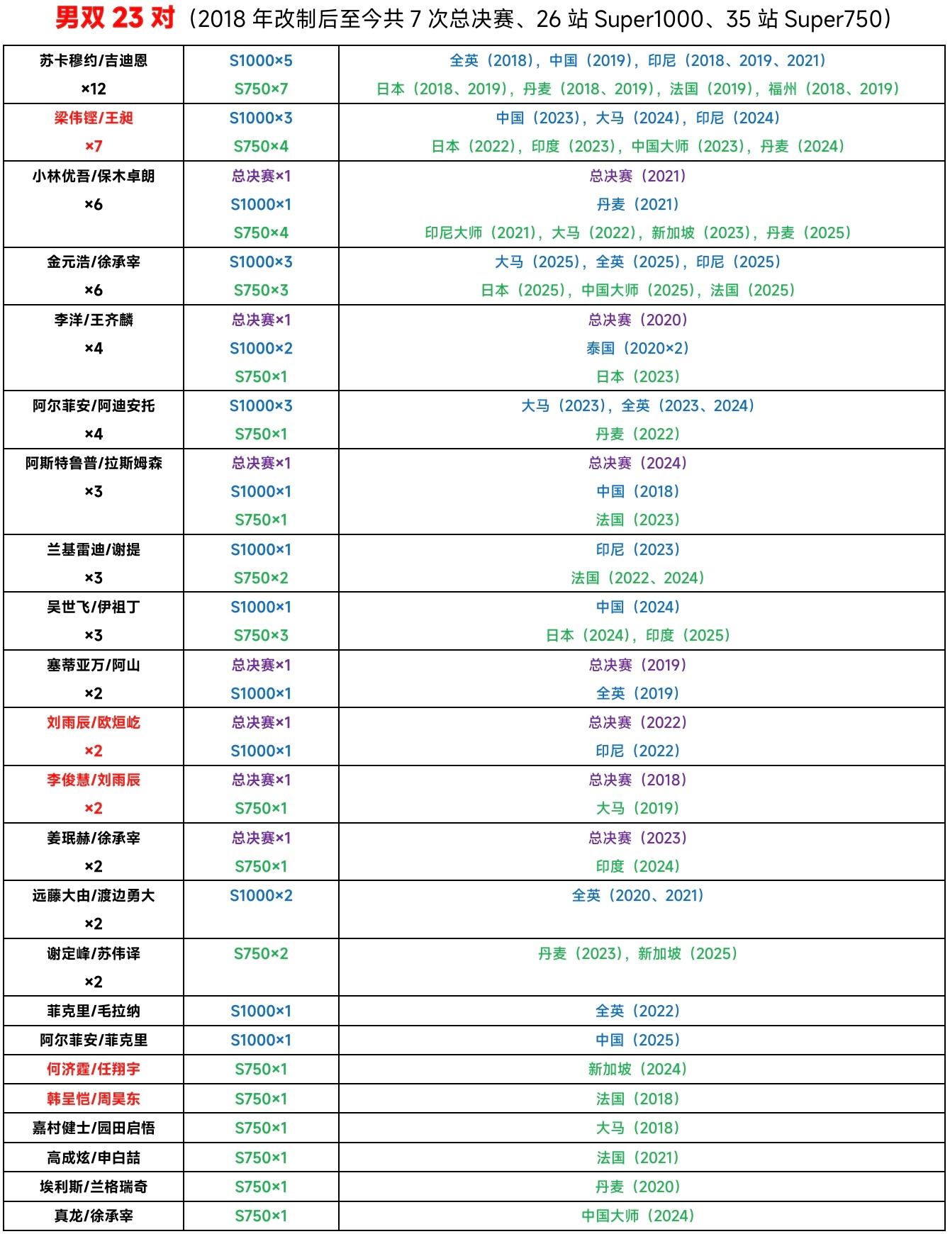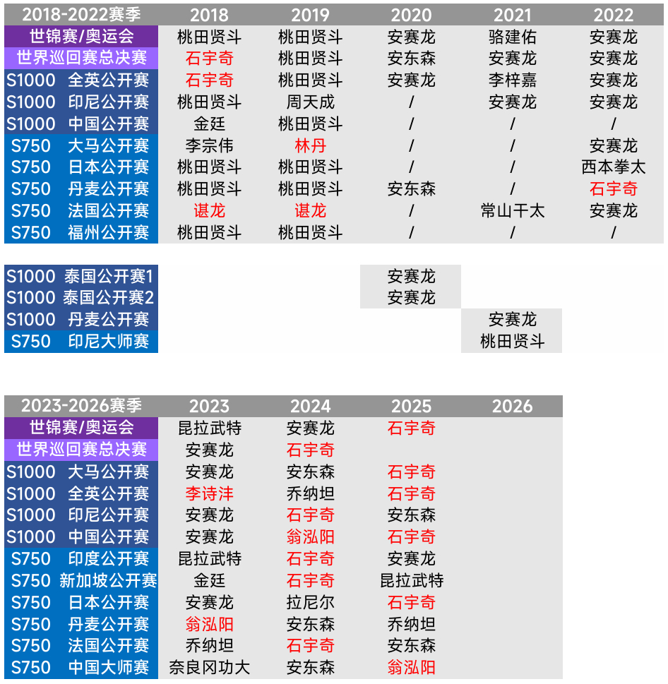 【2018年改制为世界巡回赛后的高级别巡回赛(含总决赛)冠军分布】截至2025年法国羽毛球公开赛 结束
