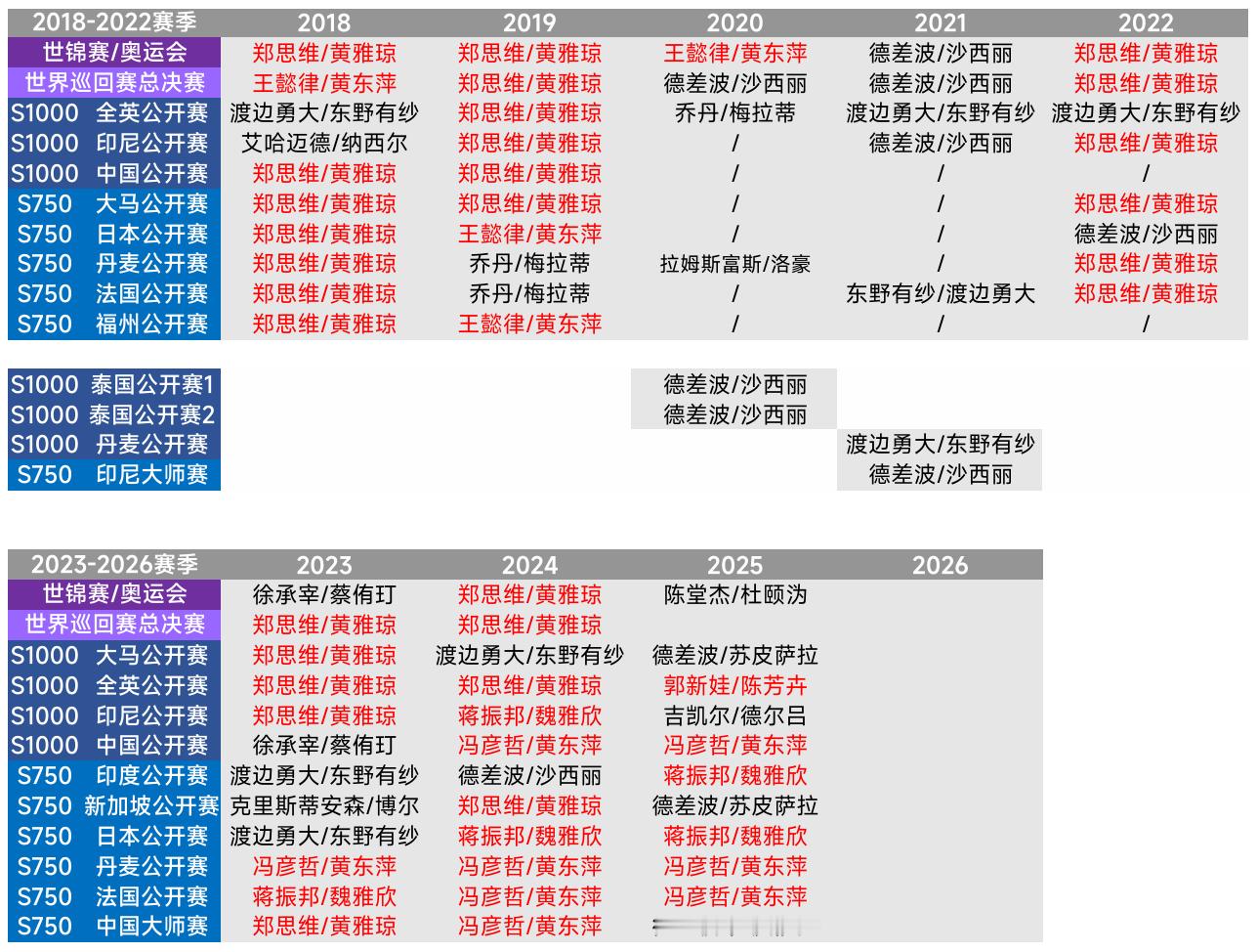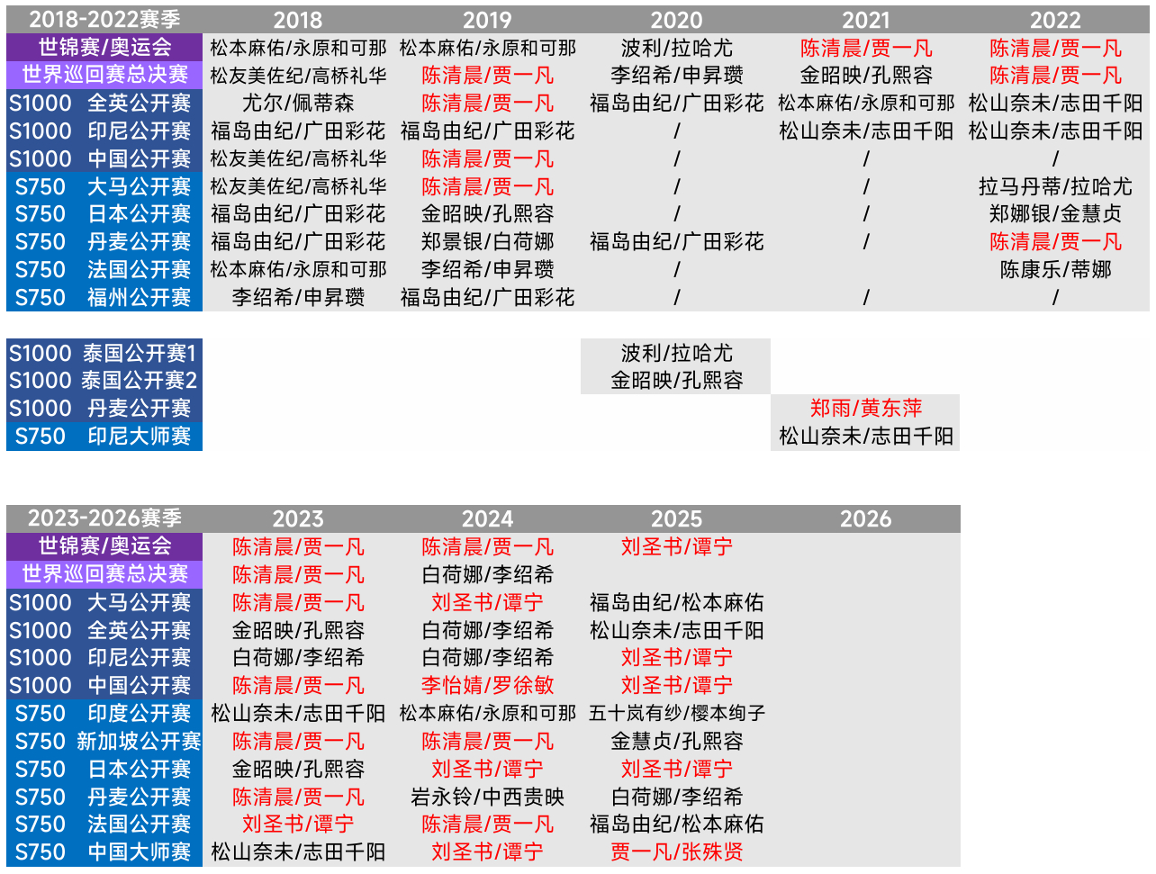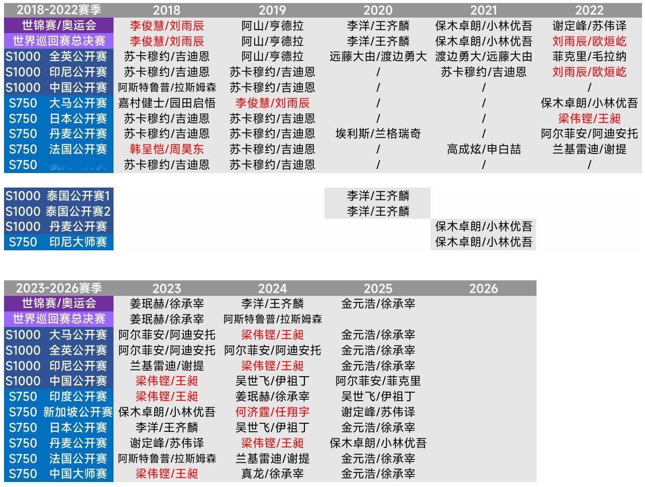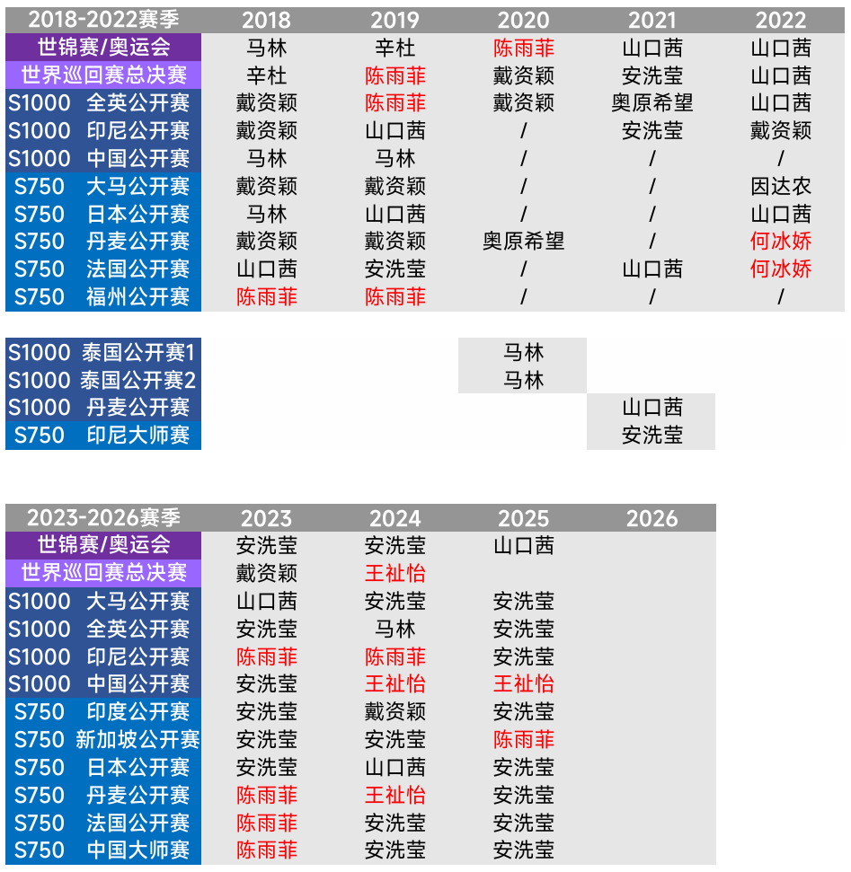 【2018年改制为世界巡回赛后的高级别巡回赛(含总决赛)冠军分布】截至2025年法国羽毛球公开赛 结束