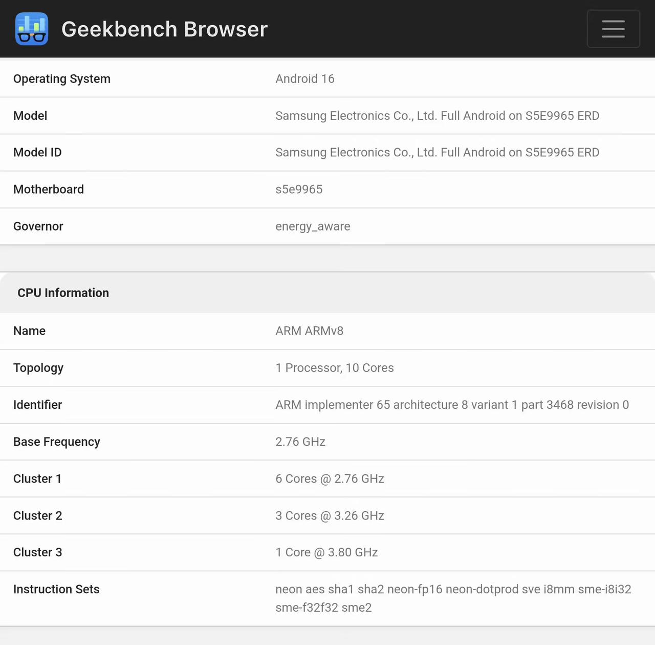 全球首款2nm手机芯片曝光!它就是三星Exynos 2600,跑分媲美骁龙8 Elite Gen5 就在最近,三星Exynos 2600现身Geekbench跑分平台,根据上面展示的跑分及参数数据来看,这款处理器的单核成绩达3455分,多核突破11621分,可以说问鼎第一梯队水平。尤其是它的多核成绩直接超越了苹果A19 Pro,不得不说三星在高端芯片领域实现重大突破。 作为全球首款2nm工艺手机芯片,能效比这块势必会展现一定的惊喜,毕竟制程更先进。就具体架构来看,三星的这款处理器采用了“1+3+6”十核架构,超大核主频达3.8GHz,性能规格实打实的高,日常用来打游戏啥的游刃有余。期待搭载这款处理器的手机发布!