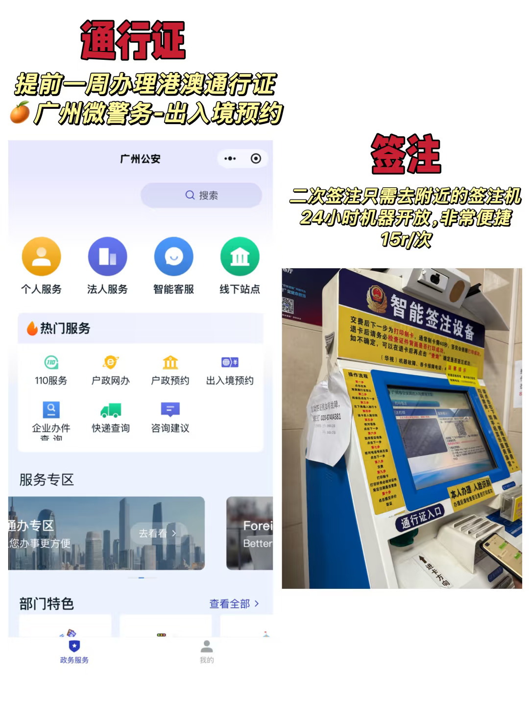 1️⃣通行证and签注:提前一周办理港澳通行证,以广州为例:🍊广州微警务-出入境预约。一般提前一天预约,一周内能拿到证件。记得办卡的同时也要办签注!一次签注能过境一次,一次签注15r。
