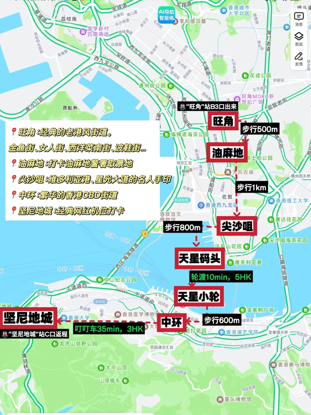 1️⃣经典一日游路线:旺角➜油麻地➜尖沙咀➜中环➜坚尼地城