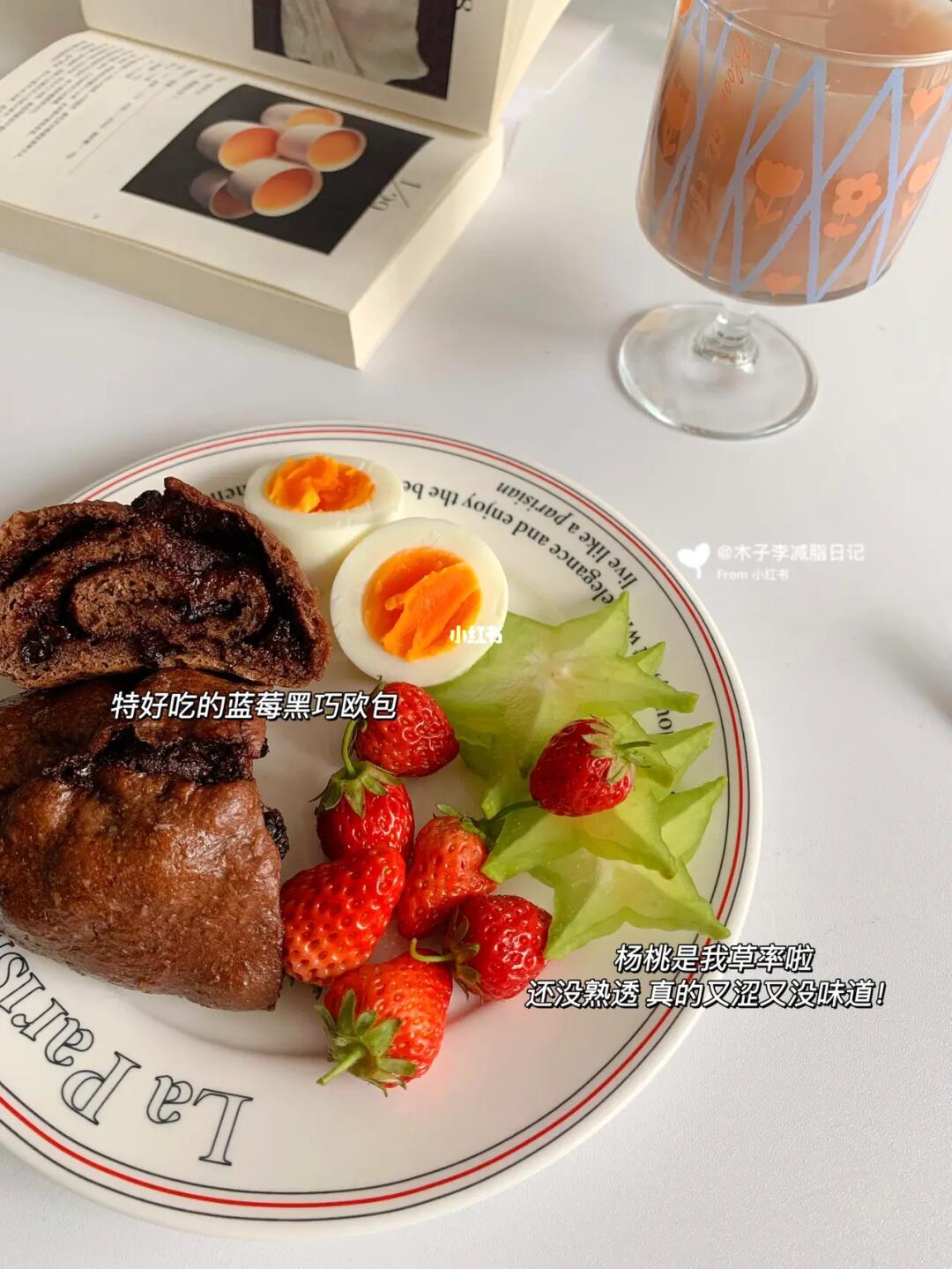 🍳早餐:全麦蓝莓黑巧欧包|鸡蛋|杨桃|草莓🍓|益生菌