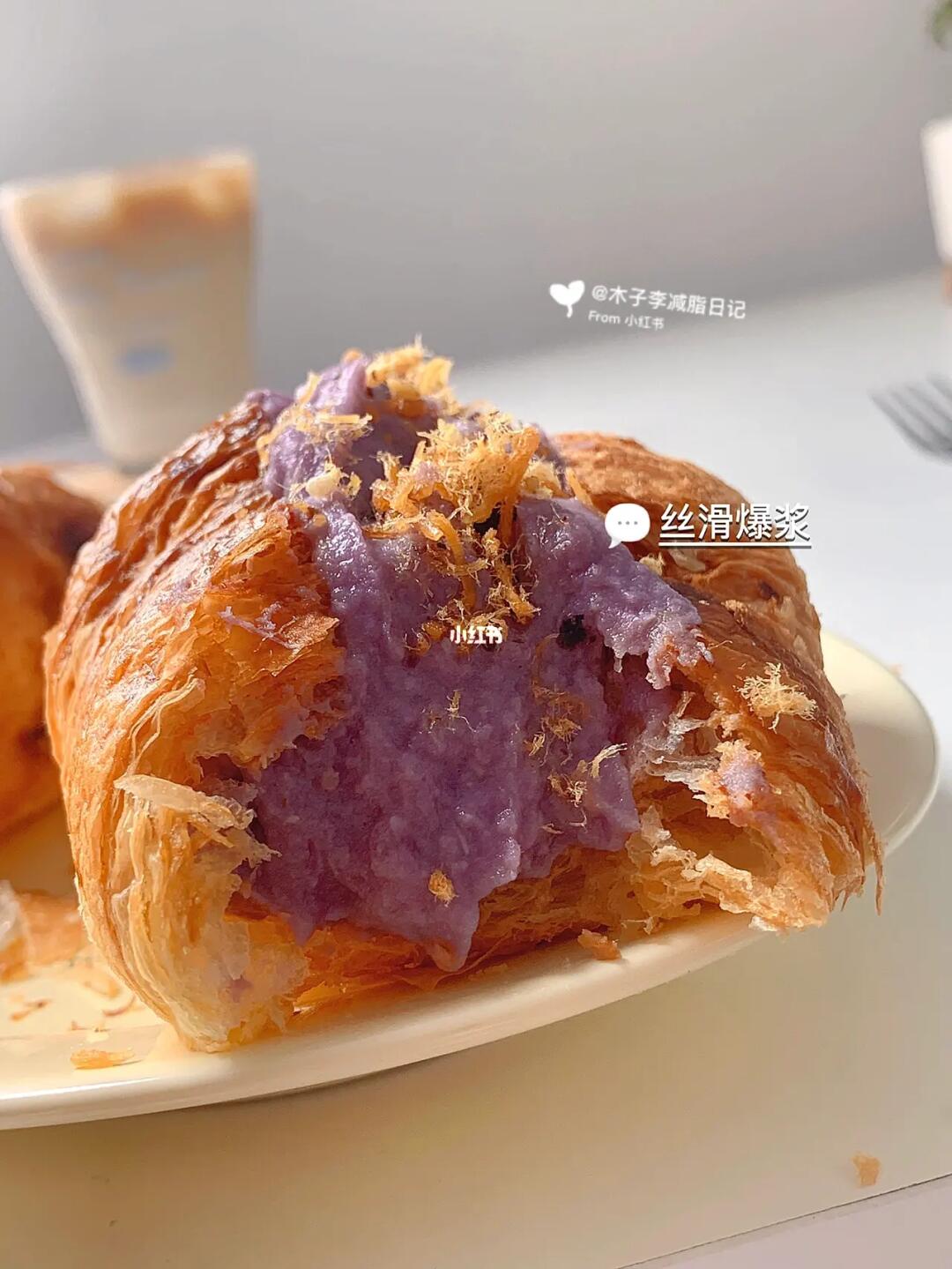 芋头和紫薯蒸熟,放入搅拌机加入牛奶,搅拌的更细腻,可颂中间切开塞上芋泥,撒一层肉松就可以啦!