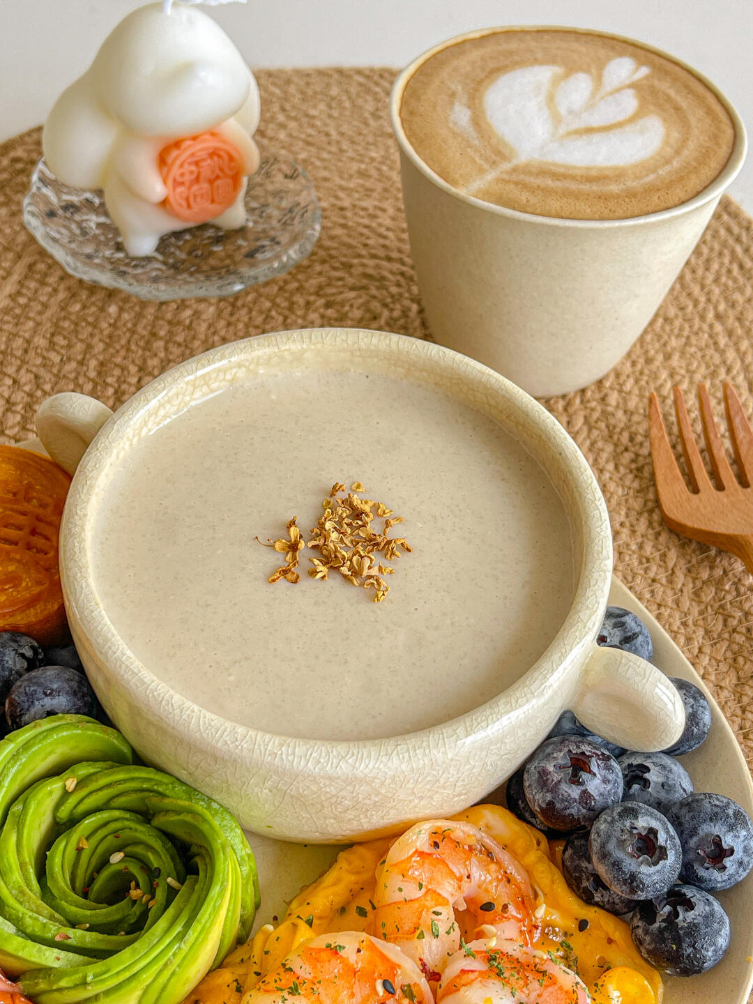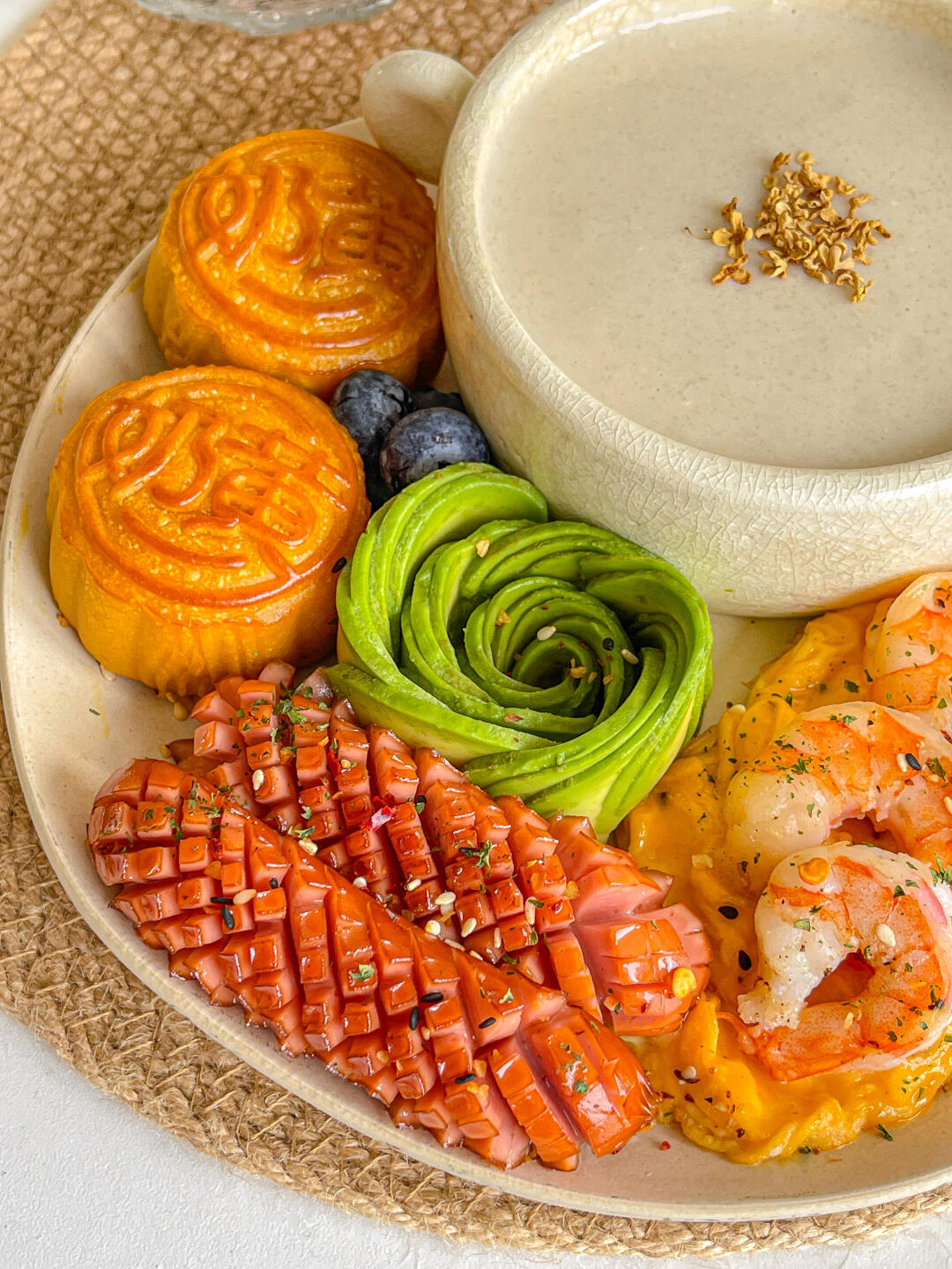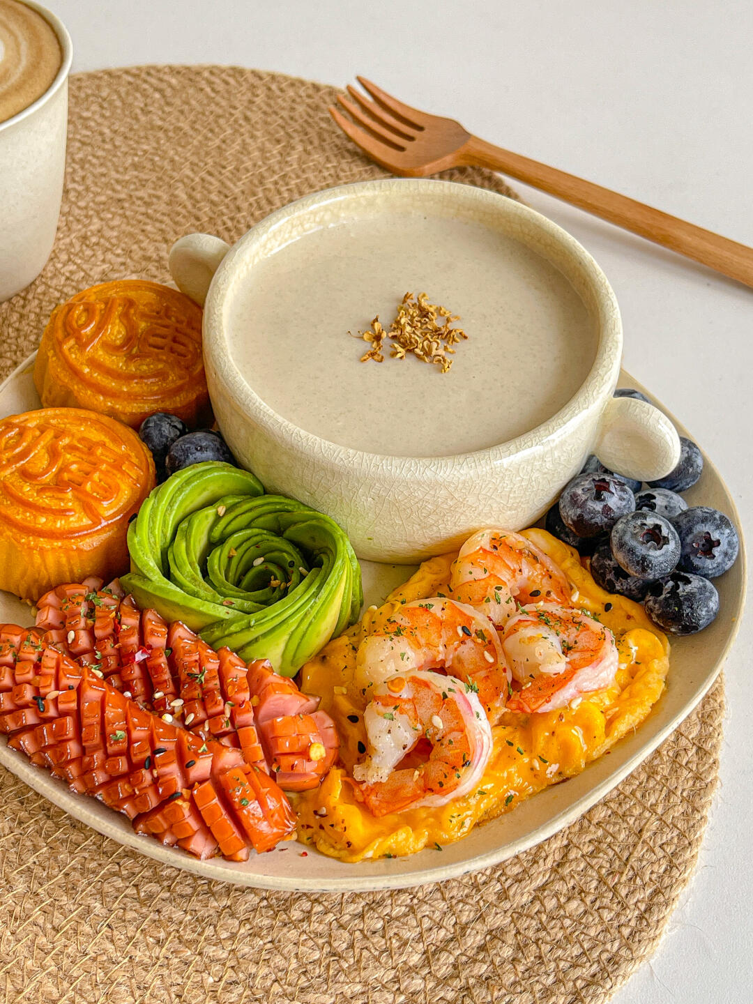 江中猴姑米稀➕奶黄月拼➕烤肠➕鸡蛋➕牛油果➕蓝莓
