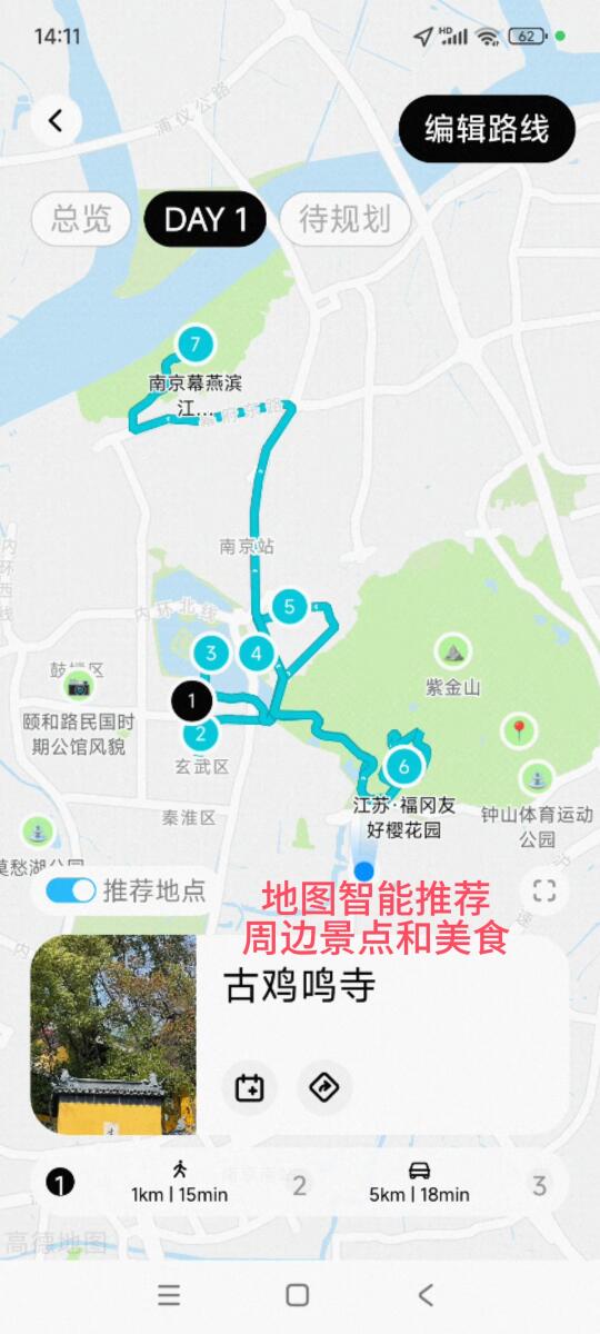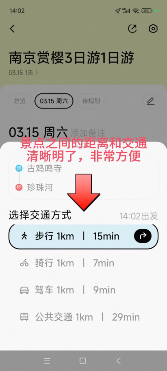 景点之间的距离和时间清晰明了,可以根据自己的需要选择交通方式