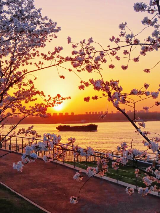 🔸燕子矶幕燕滨江风光带靠近江边,温度低,樱花会开的迟一点,江边的落日很美,晴天来看樱花可以顺便看落日