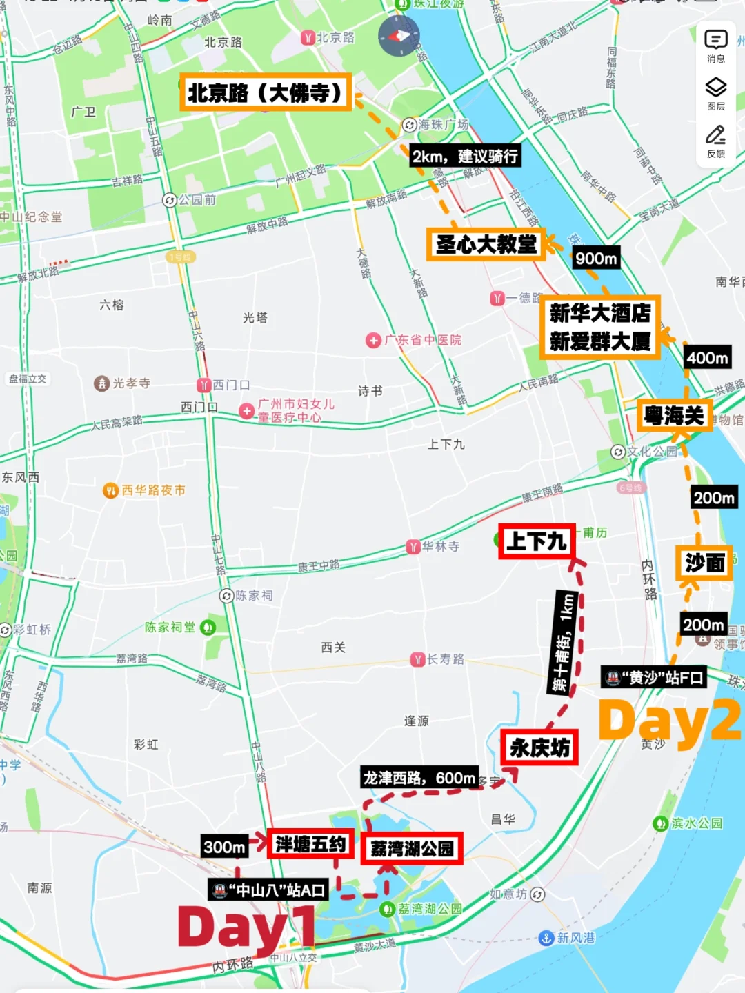 👉泮塘五约➜荔湾湖公园➜永庆坊➜上下九➜花城广场