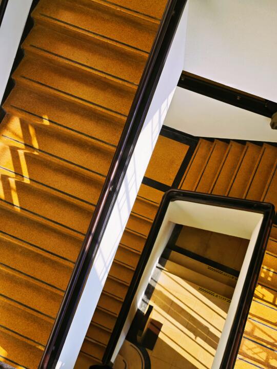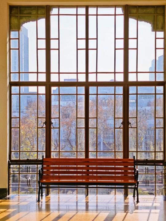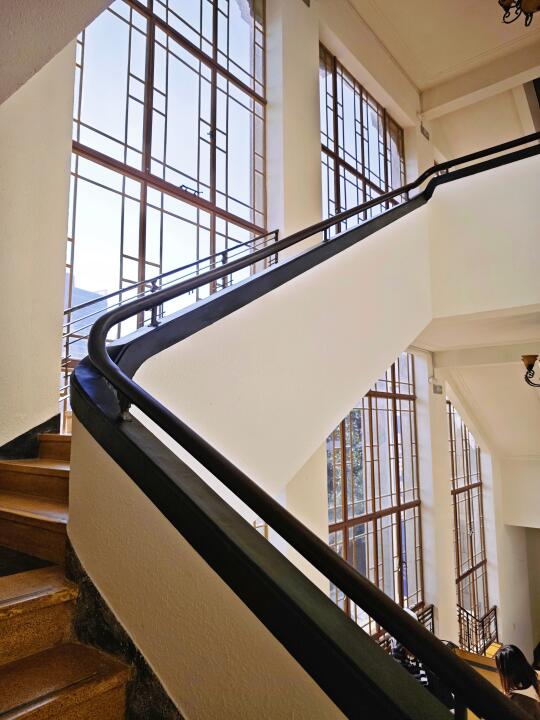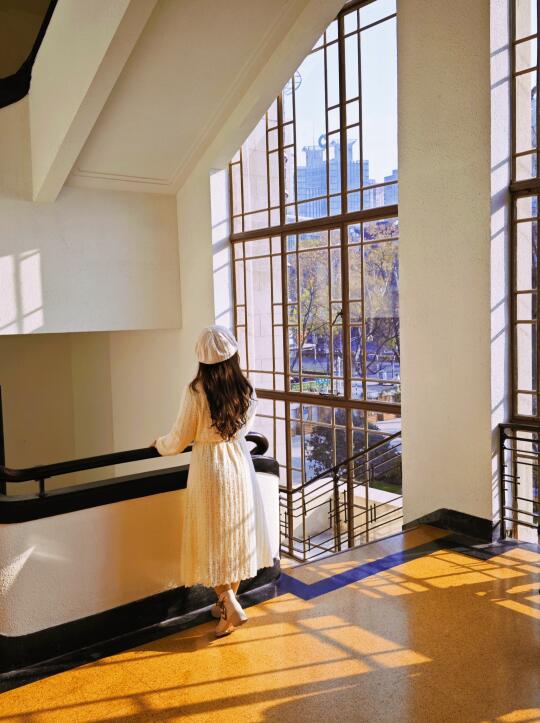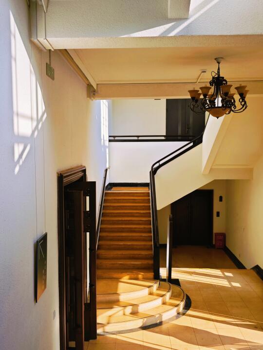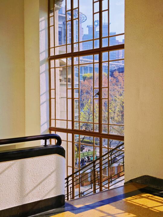 这个始建于民国的美术馆,内部设计非常有特色,朝南的一面,是木制楼梯和巨大的落地玻璃窗