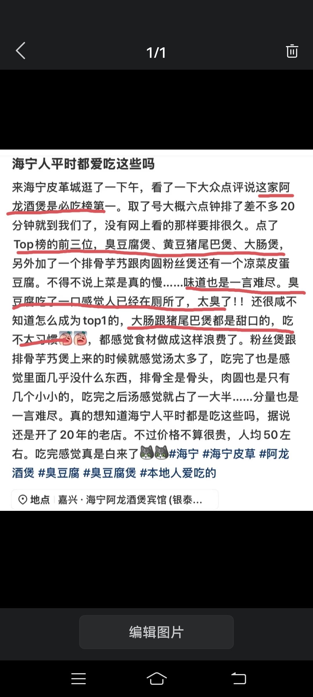一位外地网友吐槽浙江海宁的某家网红餐饮店: 1、上菜特别慢。 2、臭豆腐特别臭,感觉人已经在厕所了。 3、大肠煲和猪尾巴煲都是甜口,这不是浪费食材吗? 4、食材的量太少了。 …… 最后,这位网友总结发言:你们海宁人平时都是吃这些吗?吃完感觉真的是白来了。 我们出去旅游就算吃不惯也不会说这种侮辱性词汇,真不知道他们咋想的?在我们土生土长的浙江人看来,无论是东北的、还是西南成都重庆那一块的,你们那种一锅烩的才叫浪费食材呢,食材原本的味道根本体现不出来了。无非是现在大家的味蕾被严重带偏了而已,把他们这些地方的人自信心给整爆棚了,自认为他们那种做法才可以称之为“美食”!