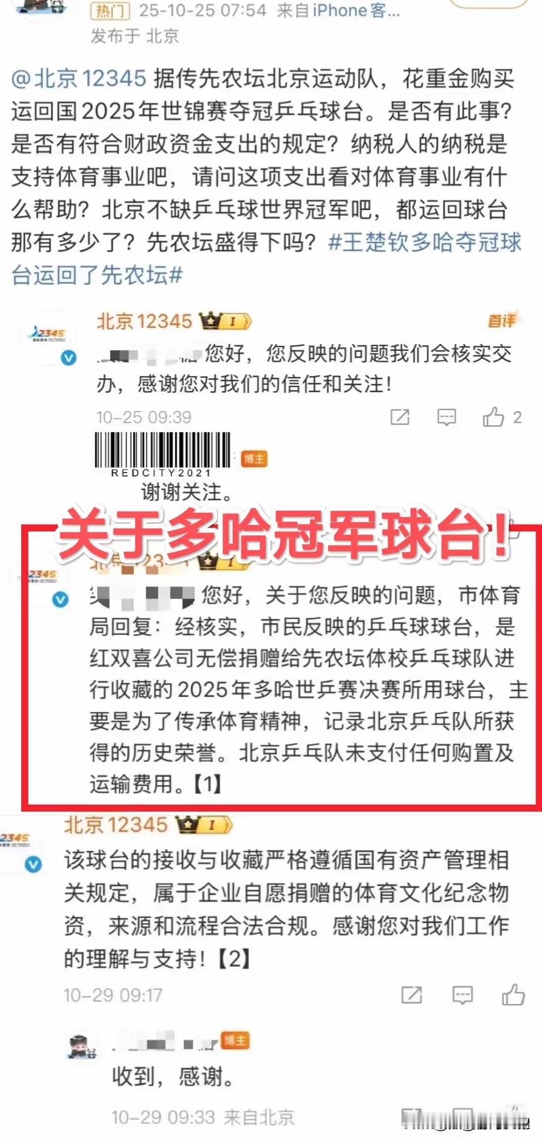 王楚钦多哈球桌谁买的?12345官方回复来了,并非张雷购买! 前段时间有消息说: 先农坛花7万购买了 王楚钦多哈夺冠球桌。 后来又有人澄清, 是北京队主教练张雷自己掏钱买的! 现在实锤了! 是红双喜免费送给先农坛的! 我就说嘛, 丁宁怎么能拿纳税人的钱, 买这球桌呢! 28年洛奥王楚钦夺冠, 那球桌咱再出手买下[呲牙]