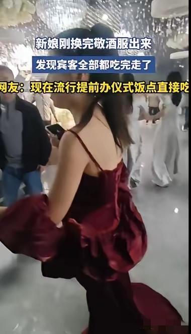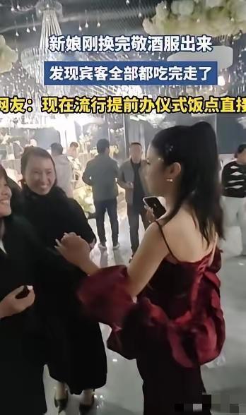 新娘刚换完敬酒服出来,发现宾客已经吃完全部都开始散场! 这尴尬简直溢出屏幕!新娘子精心打扮,想在人生最美的时刻敬酒致谢,结果连观众都没了,满心期待全落了空。 其实宾客也没恶意,现在大家都懂“仪式提前、饭点开吃”的套路,吃完抹嘴走人,没人真在乎敬酒流程。 几万几十万办的婚礼,说白了就是自我感动的仪式感。别人记不住你的婚纱多好看,只关心菜合不合口;婚纱照拍得再精致,最后也是压箱底,所谓的祝福大多是人情往来。 真不如把办酒席的钱拿去旅游,两个人好好享受二人世界,比应付一堆虚头巴脑的场面实在多了。婚礼的核心是新人,不是给别人看的表演。 你觉得婚礼仪式重要还是实用体验重要?如果是你,会选盛大酒席还是旅行结婚?