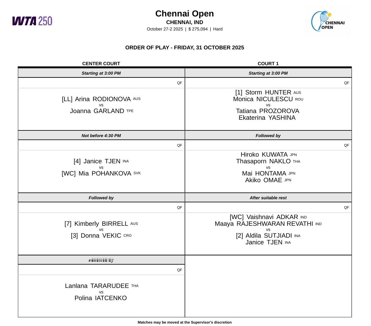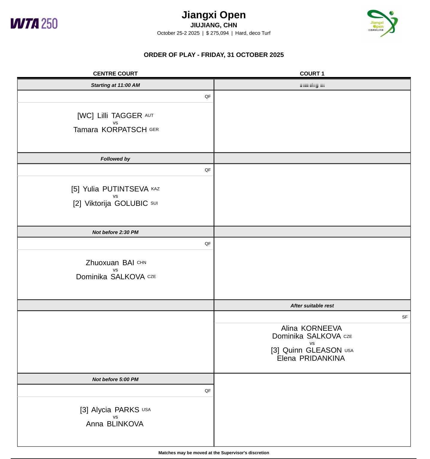 三站WTA250赛事展开1/4决赛较量,以下安排均为北京时间⏰