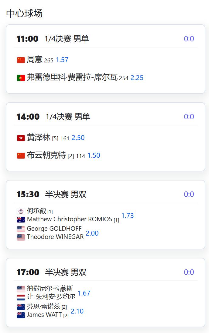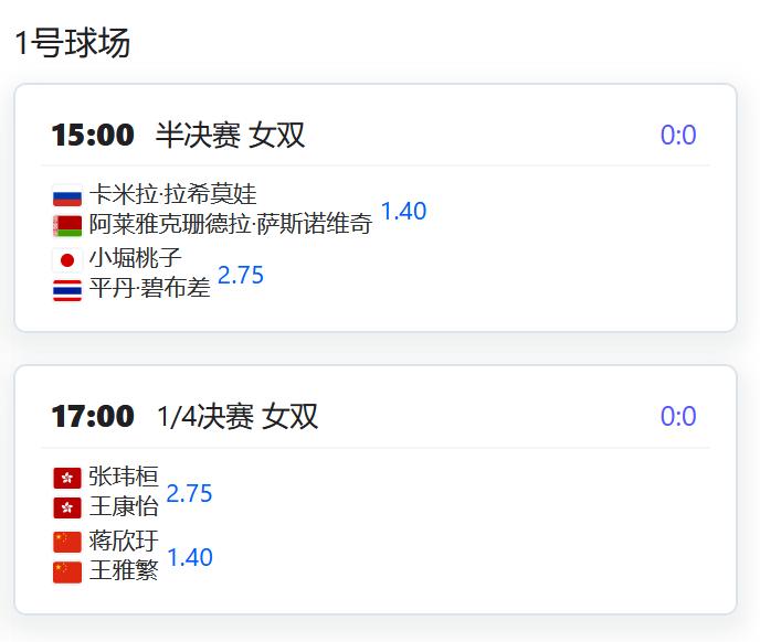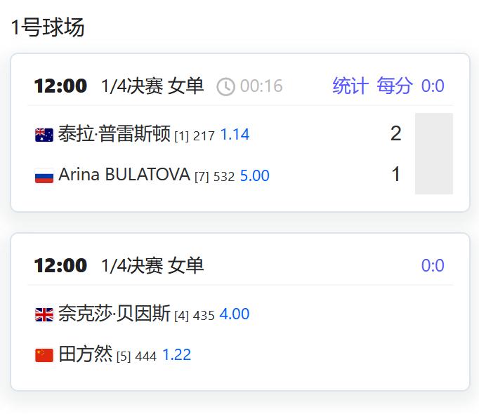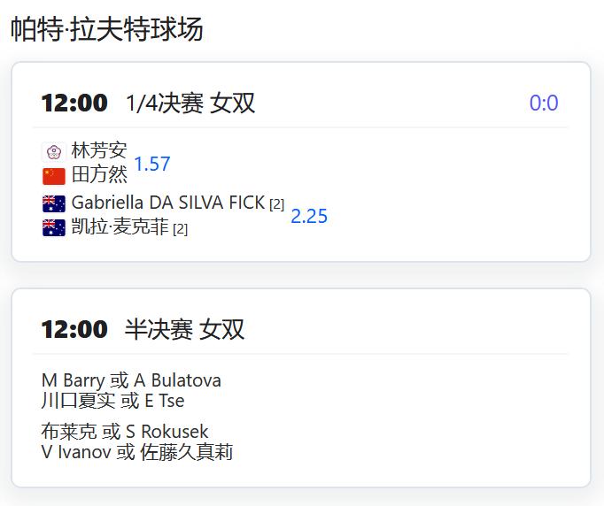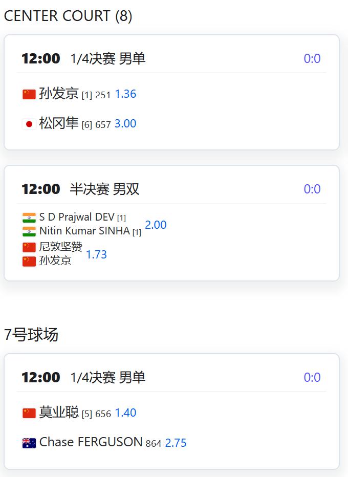 今日赛程: WTA250赛九江站,女单四分之一决赛,白卓璇将与沙尔科娃争夺一个四强席位; WTA250赛香港站,女双四分之一决赛,王雅繁/蒋欣圩将与张玮桓/王康怡争夺一个四强席位; CH100首尔,男单四分之一决赛,周意将对阵葡萄牙球员席尔瓦; 布云朝克特将对阵5号种子中国香港的黄泽林; W35布里斯班,田方然一日双赛,单打四分之一决赛对阵4号种子贝因斯,双打四分之一决赛对阵2号种子澳洲本土组合; M25千岛湖,孙发京一日双赛:单打与6号种子松岗隼争夺男单四强,双打搭档尼敦坚赞对阵头号种子; 莫业聪将与澳大利亚的弗格森争夺一个男单四强席位。