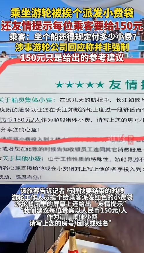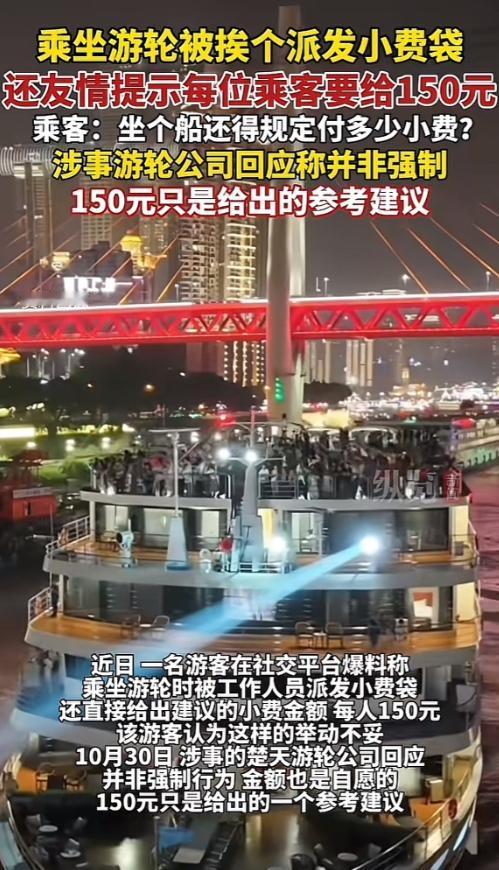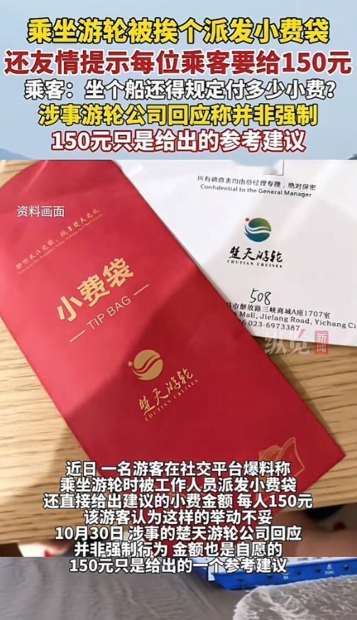 10月28日有游客爆料,坐“长江如歌”游轮从宜昌去重庆,行程收尾时在餐厅被工作人员挨个发红色小费袋,屏幕还提示建议每人给150元,能随账单线上付。他发现投币箱里就三四个袋子,没几人给。 “长江如歌”游轮的航线覆盖宜昌至重庆往返,根据行程差异分为五天四晚和四天三晚两种选择,船票价格从1999元每人到39999元每人不等。 除了基础的交通与住宿服务,游轮还为游客安排了丰富的配套活动,包括联欢晚会、太极操练习,行程中会停靠沿途景点,并有专业导游全程提供讲解服务。 而引发争议的小费规则,具体执行方式是在行程收尾阶段,工作人员在餐厅内逐一向用餐游客递上红色小费袋,同时餐厅屏幕上滚动播放“友情提示”,除了建议支付金额为每人150元,还要求游客在小费袋上注明自己的房号、团队名称或姓名。 小费的支付渠道也较为灵活,既可以在结算其他消费时一同线上支付,也能直接将装有钱款的小费袋投入指定的收集箱中。 一名游客于10月25日登上“长江如歌”游轮,开启了从宜昌前往重庆的旅程。 10月29日,就在行程即将结束、游客准备下船之际,餐厅内出现的小费袋发放场景让他颇为意外。 据这名游客回忆,当时看到工作人员逐一发放小费袋的举动时,他第一反应是“很惊讶”,在他看来,这种带有明确金额建议的发放行为,更像是一种变相的付费暗示,而非单纯的自愿表达渠道。 事后他留意了放置小费袋的收集箱,发现里面仅有三四个袋子,这意味着主动选择支付小费的游客数量寥寥无几。 而在10月28日,也就是下船前一天,这名游客通过社交平台将自己的经历公开爆料,相关内容很快引发了网友的广泛关注和讨论。 10月30日,涉事游轮所属的楚天游轮公司针对此事接受了现代快报记者的采访,并作出回应。公司方面明确表示,收取小费并非强制要求,而是沿用了国内外游轮行业的普遍惯例,目的是为对船上服务感到满意的游客,提供一个表达认可的自愿渠道。 工作人员补充说明,小费的收取并未提前在登船时进行,游客完全可以根据自身感受决定是否支付,支付金额也可自主调整,150元仅为参考标准。 但公众对此回应并不买账,多数网友表示,国内消费市场本就没有支付小费的习惯,游客购买的船票已经是明码标价,其中理应包含了相应的服务费用,游轮公司理应自行承担员工薪酬,而不是通过这种方式将成本变相转移给游客。 更让网友不满的是,逐人发放小费袋并明确建议金额的做法,整体观感极差,完全违背了国内消费者的普遍认知。 从游轮公司的初衷来看,其试图借鉴国外游轮行业的小费传统,为服务质量建立一个游客认可的反馈机制,这一想法本身并无不妥。 但问题的关键在于,这种行业惯例并未充分适配国内的消费文化环境,国内消费者早已习惯了“一价全包”的服务模式,明确的金额建议在很大程度上削弱了“自愿支付”的核心属性,导致整个执行过程尺度把握失当。 这种将国外惯例生硬移植的做法,忽略了本土文化与消费习惯的差异,自然难以获得公众的理解和接受。 今天的分享到这里就结束了,大家对此事有何看法,欢迎在评论区留言和讨论,感兴趣的可以点击头像加关注,我将每日更新优质内容,我们下期见。