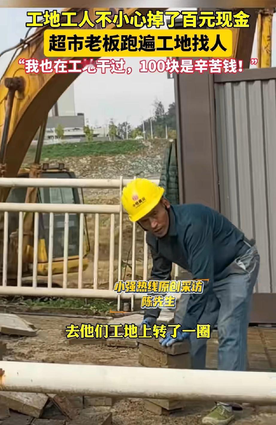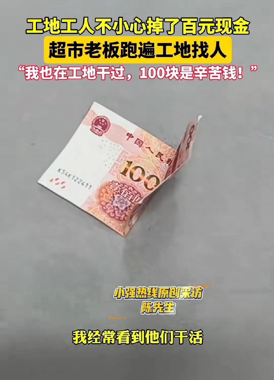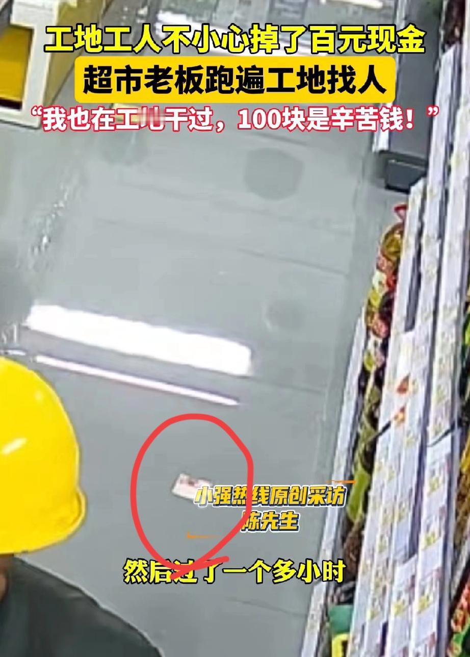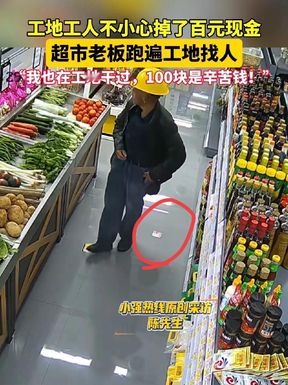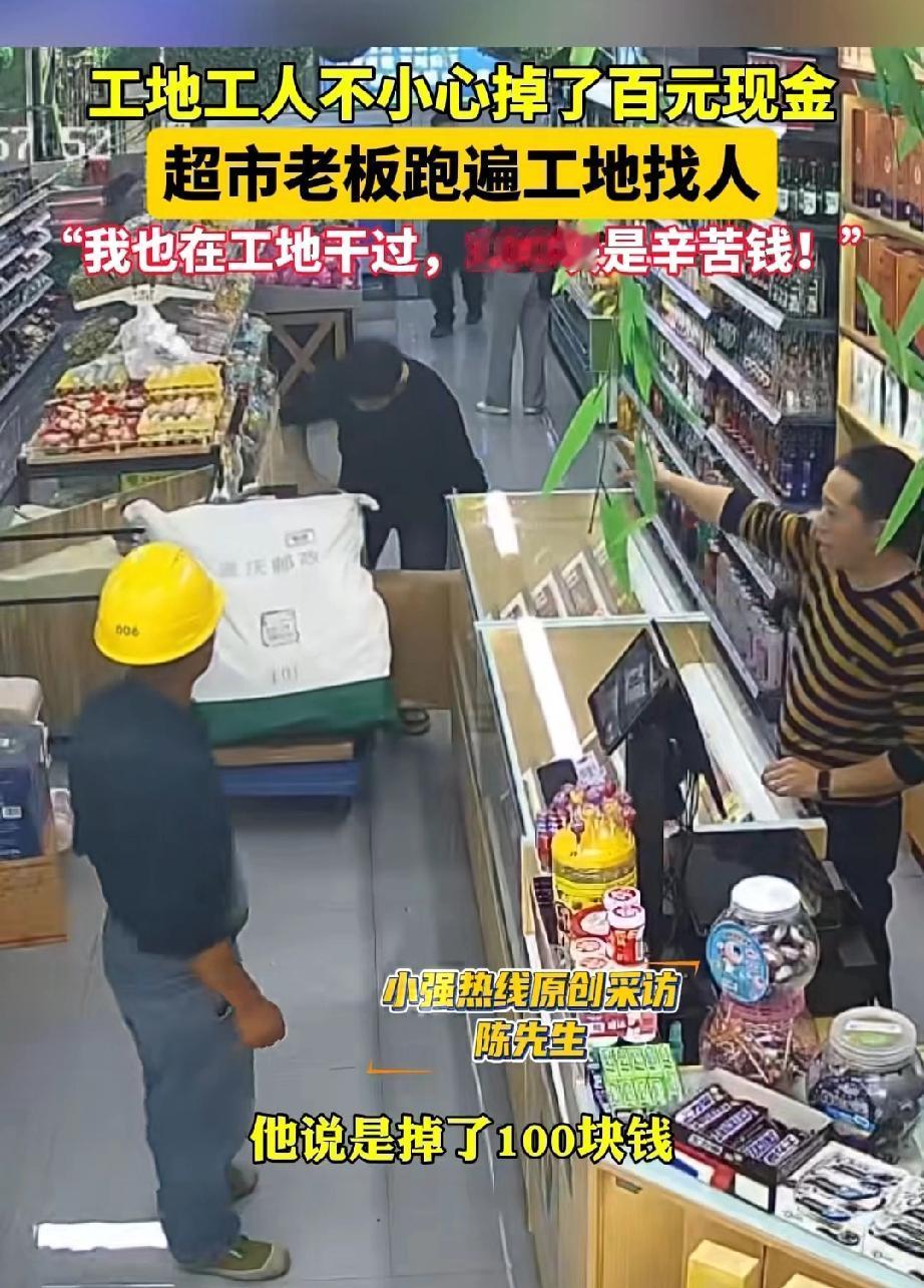重庆,超市老板发现地面上掉落了一百元。他调取监控后,发现是一名在建筑工地做工的工人掏口袋时不慎遗落的。 超市老板等了一天也没人来寻钱。 工地离超市不远,第二天,老板便依照工人安全帽上的字样,开车前往工地寻找。 找了好一会儿,才看到丢钱的工人正俯身搬砖。超市老板唤他:“老表,老表。” 工人疑惑地站起身,问道:“有啥子事吗?” 老板问他:“你昨天是不是丢了一百元?” 工人赶忙回答:“是的哟,我一天才赚一百多块钱,丢了太心疼,一天白干了。” 老板说:“那你昨天去的超市可能捡到了,你有空去超市把钱领回去。” 老板回到超市不久,工人就来取走了钱,并对老板表达了感激。 有人问,为何不直接把钱给工人? 老板说:“我想再确认一下,这是不是他丢的钱。” 这钱本是超市老板捡到的,无人来寻,他自己留着用也无可指责。 但超市老板说:“我以前也在工地干过,大家赚的都是辛苦钱,我可不能这么做。” 这位老板心思细腻,亲身经历过劳作的艰辛,却仍愿以温柔之心,为他人撑起一片善意的天空。他有着拾金不昧的高尚品质,我想他做生意必定也是严谨认真,超市里的产品质量应该值得信赖。 来源:小强热线浙江教科