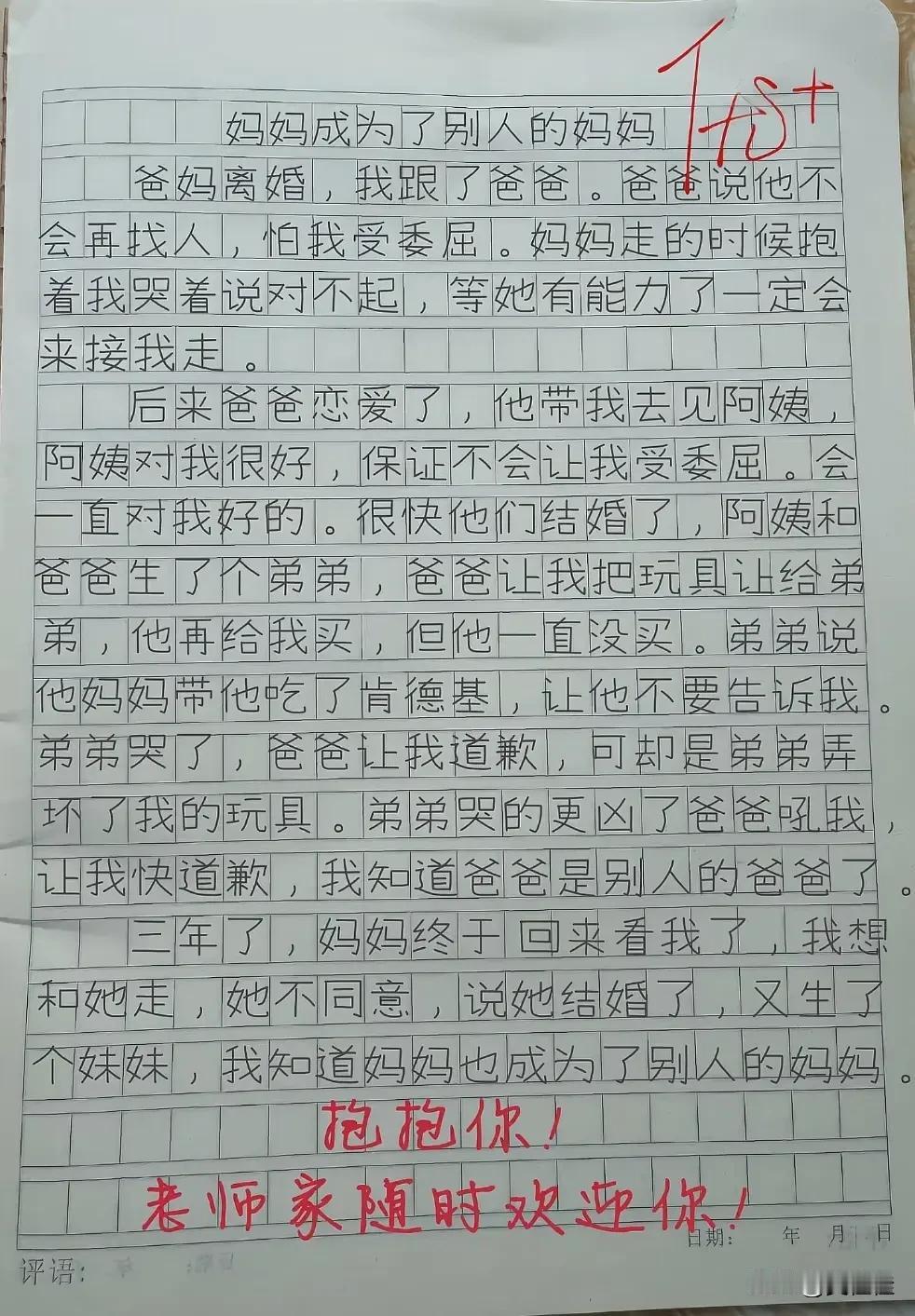 一篇小学生作文,为何让无数成年人泪目? 当看到《妈妈成为了别人的妈妈》这个题目,或许你以为是个普通的校园习作,可读完才发现,那满纸的“大白话”里,藏着一个孩子被重组家庭撕裂的孤独与委屈。 爸妈离婚时的承诺还在耳边,爸爸再婚有了弟弟后,“让玩具”是常态,“背黑锅”是日常,原来他早已成了“别人的爸爸”;妈妈三年后归来的拥抱那么暖,可一句“我结婚了,有了妹妹”,让“接我走”的约定彻底成了泡影,她也成了“别人的妈妈”。 没有华丽的辞藻,只有孩子视角里最直白的观察——玩具被抢要道歉,亲生父母成了别人的依靠,这份纯真里的刺痛,让多少为人父母、为人子女的读者,在字里行间红了眼眶。这哪里是一篇作文,分明是一个孩子藏在作业本里的无声呐喊,每一个字都在叩问着重组家庭里“爱与被爱”的边界,又有几人能平静读完?