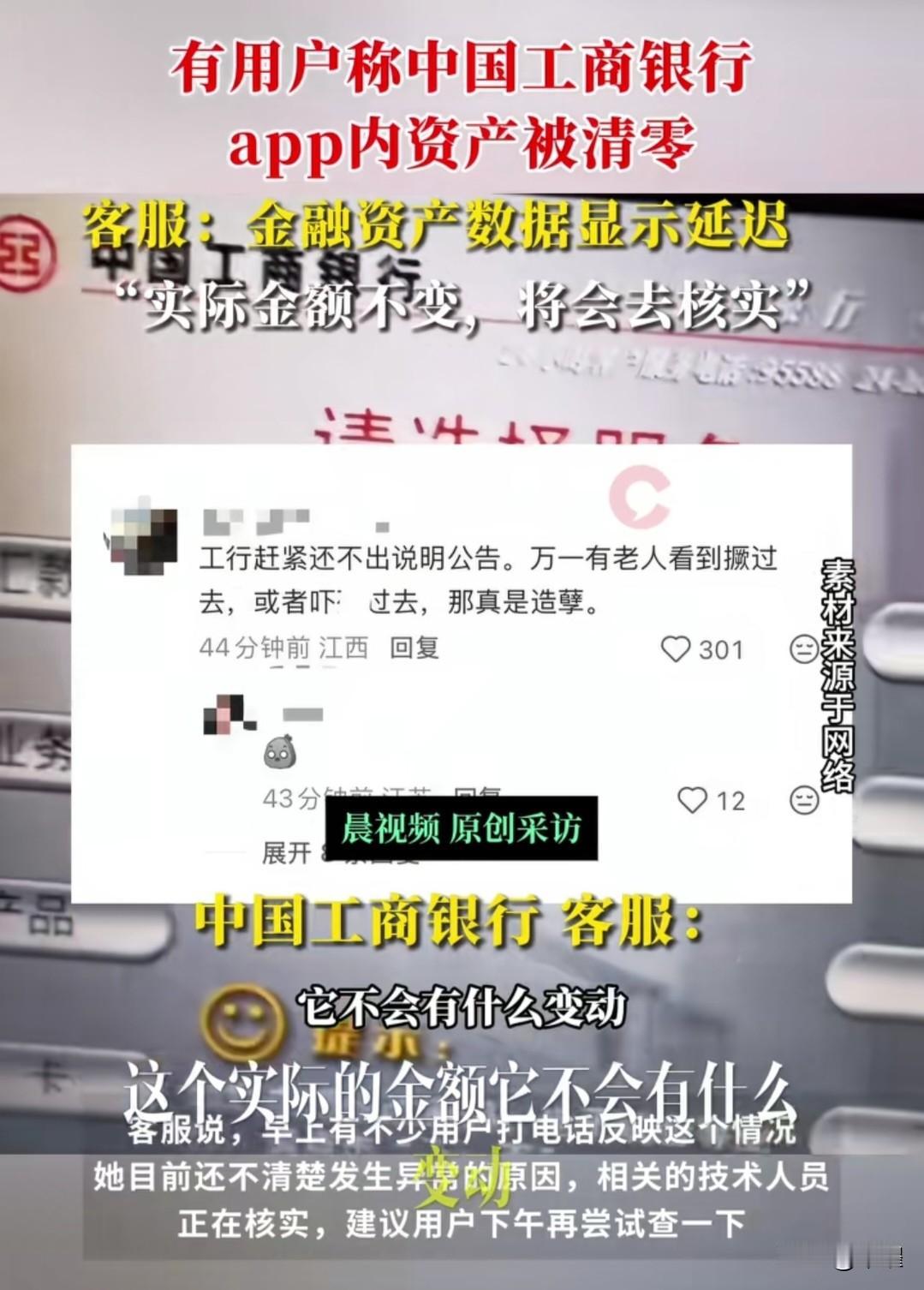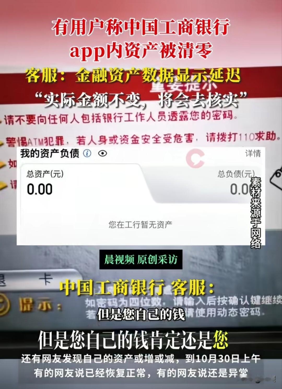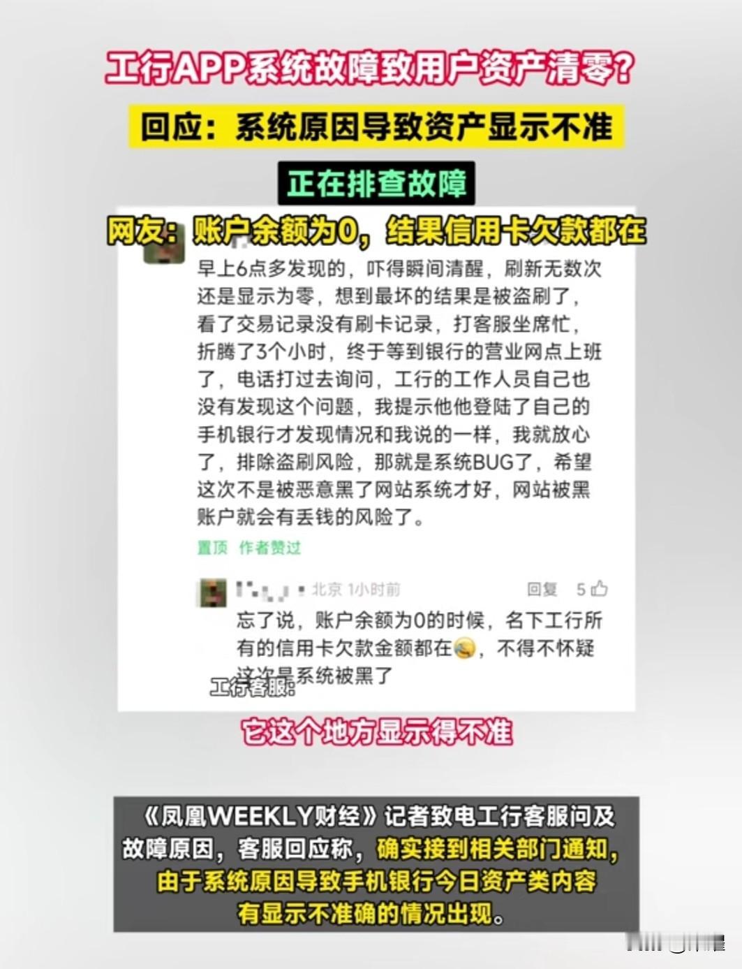 欠款还在, 余额清0。 这是什么操作? 压力测试吗? 工商银行客服说,实际金额是不变的,技术人员正在排查解决这个故障。有的恢复了,有的还显示异常。 但愿只是系统出的小问题吧。 别跟狼来了的故事一样,有一天真的把大家的钱清零了。 一张张钞票变成了屏幕上的数字。 便捷也有风险 虽然存款不多,但也想找个靠谱的方案。 存单靠谱吗? 工商取钱 存款为0 信用卡呆账止付 贷款余额 贷款记录消除 清零欠款 银行 分享今日的感悟