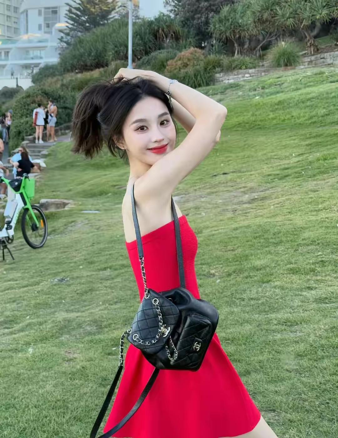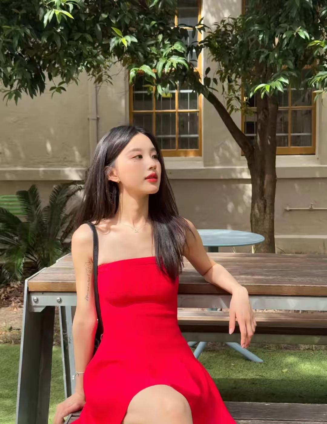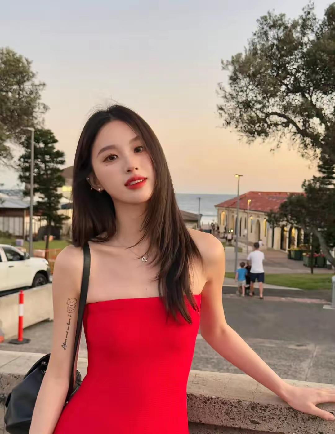 海边漫步,红裙飘逸,微风拂面,自在悠然。