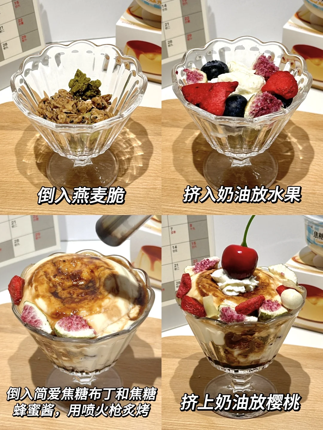 ✅食材:简爱焦糖布丁、燕麦、水果、小饼干、奶油