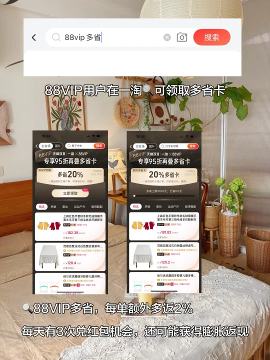 4. 88VIP多省卡领取方式:88VIP用户打开一淘APP,在搜索框搜索“88VIP多省”,会出现多省卡弹窗,点击即可领取;非88VIP会员可开通会员享受该福利,适合双十一提前囤秋冬好物时使用。