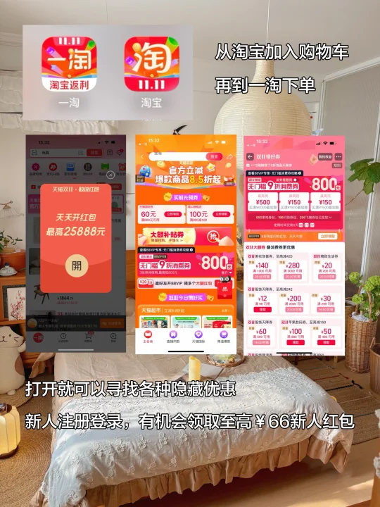 1. 基础省钱操作:先在淘宝加购商品,再到一淘下单,打开一淘即可查看返利金额,同时可寻找隐藏优惠,轻松省下一杯奶茶或一束鲜花钱;新人注册登录有机会领取至高66元新人红包。