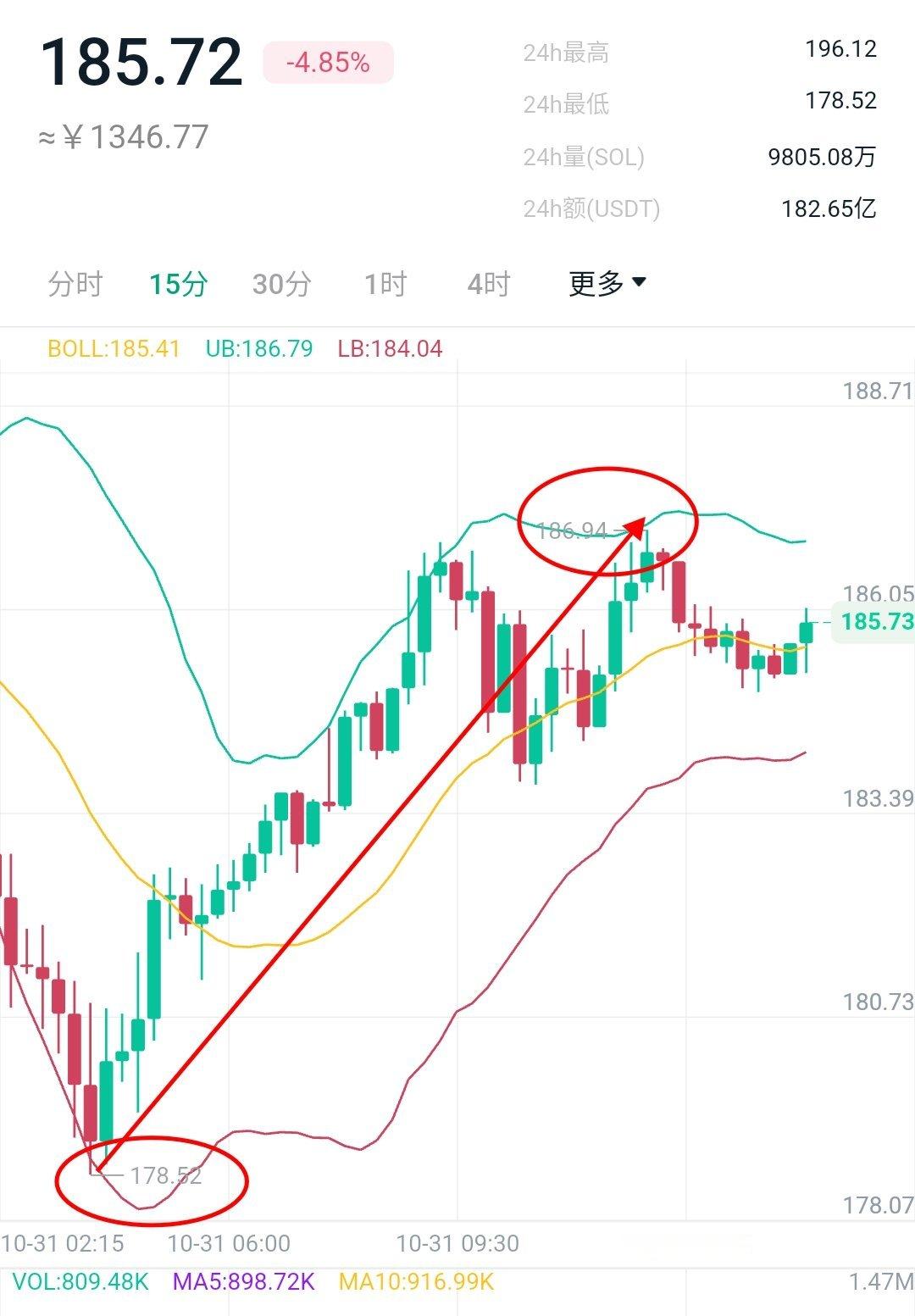 接下来SOL关注190一带阻力,首次触及190-192区域箜,下看180附近。