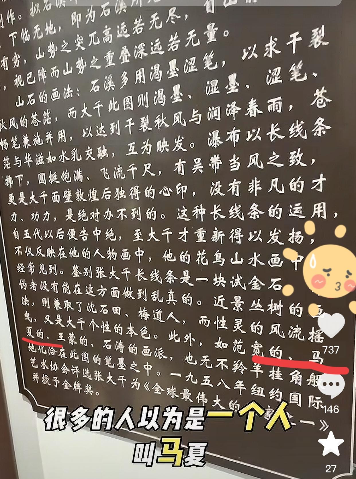 沈巍今天给艺术馆提意见,发现一个地方有争议。 沈巍今天带众主播再次逛艺术馆,走到张大千字画前,说想给馆方提一个意见。他指着墙上的字念:范宽的,马夏的,马夏是两个人[呲牙]你这样一写,那些文学美术常识不是很多的人以为是一个人叫马夏,实际上是两个人,马远和夏圭,应多加两个字,多加一个标点符号,顿一顿。不然我就怕八一你认识一个叫马夏,以为是马靠的老祖宗。 沈巍这一发现,不知道能否引起馆方重视。之前“履薄临探”在经过网友的调查和讨论之后,馆方已经闭馆更改了。沈巍说,改是改了,就是态度不怎么样[捂脸]