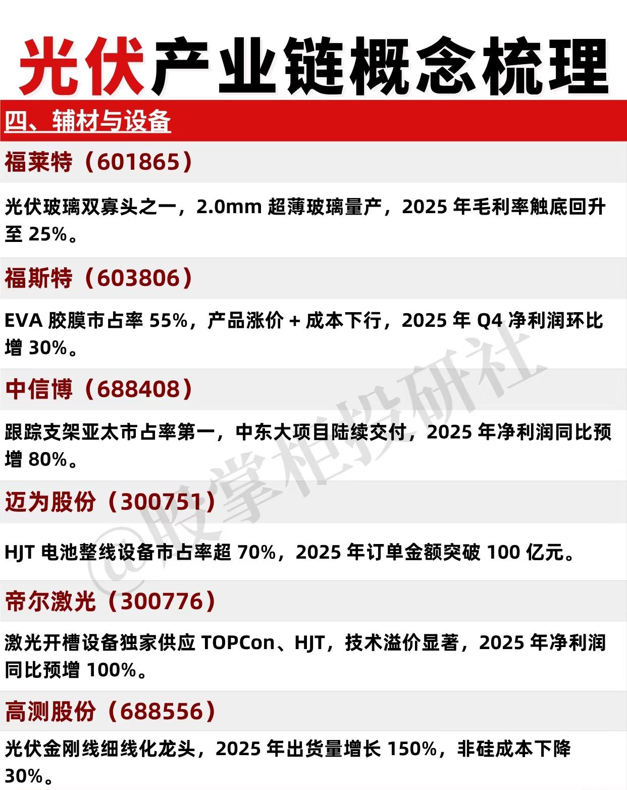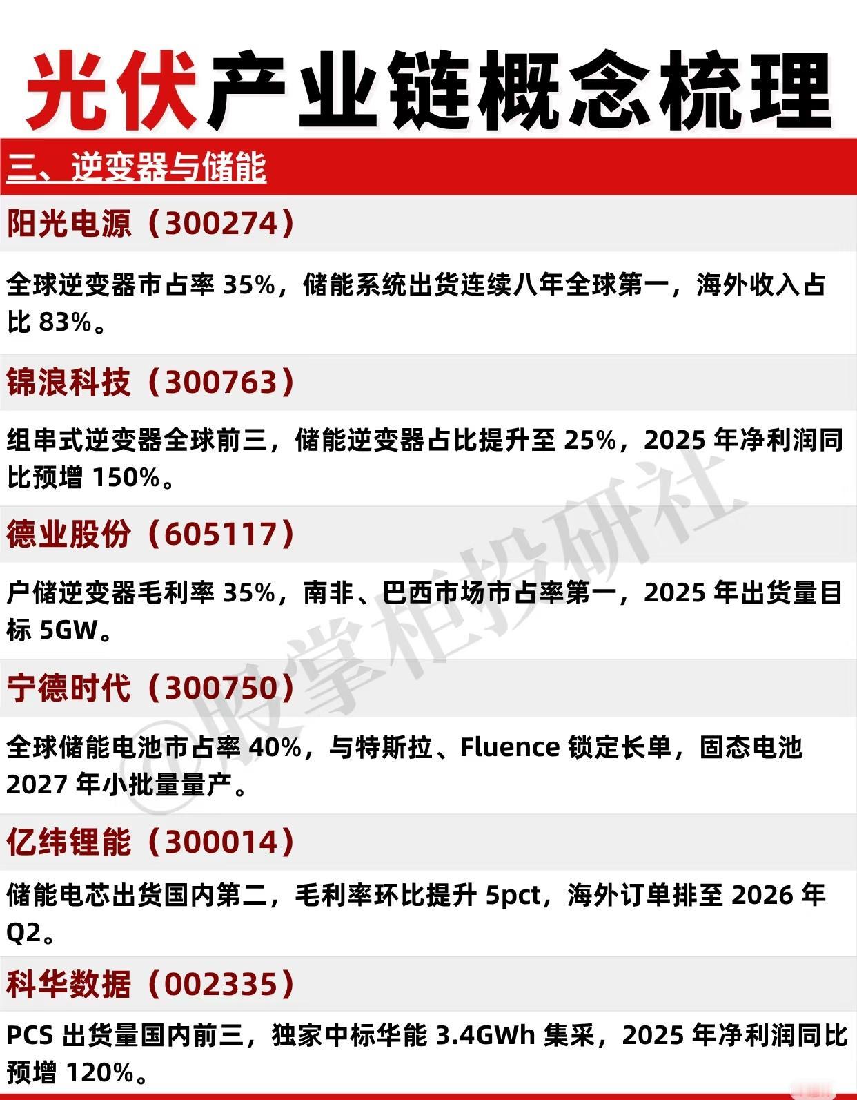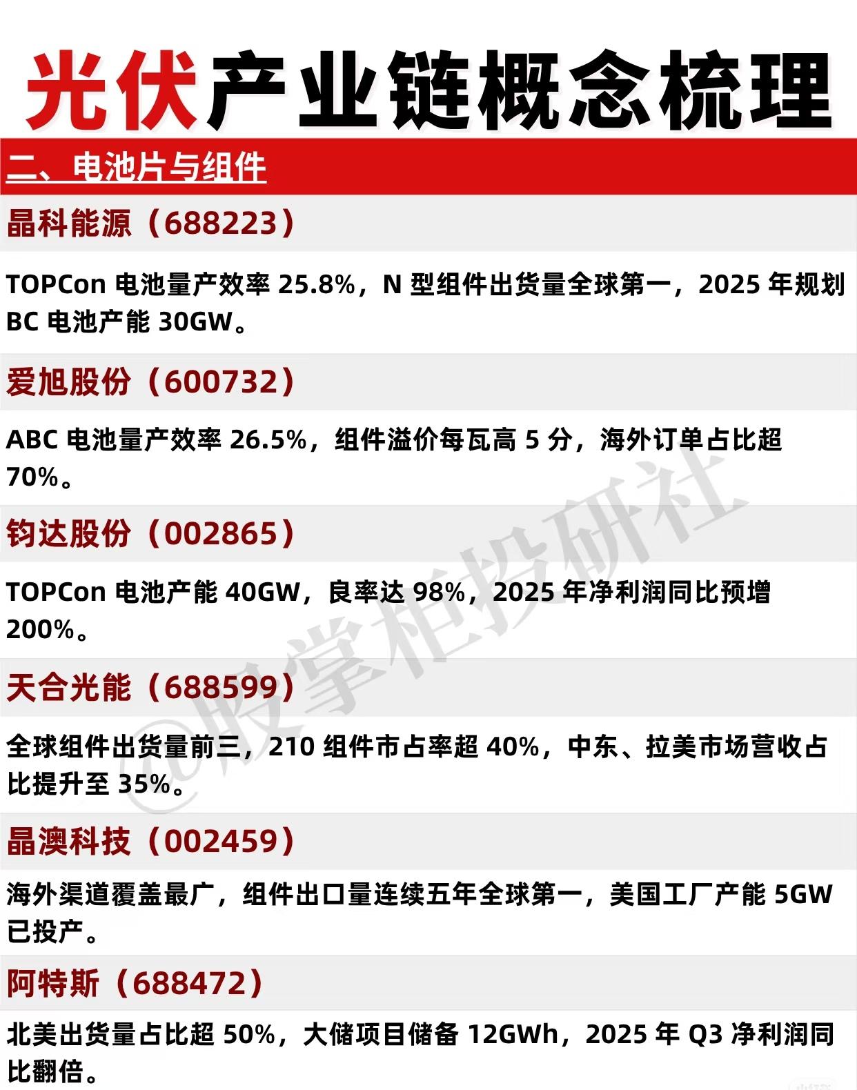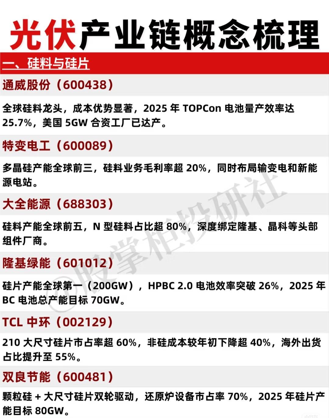 光伏产业链主要环节及相关龙头企业的全面总结: 一、硅料与硅片环节 该环节是光伏产业链的最上游,核心是生产多晶硅(硅料)以及将其加工成硅片,是决定光伏组件成本与效率的关键环节。 - 通威股份(600438):全球硅料龙头企业,具备显著的成本优势,2025年其TOPCon电池量产效率达到25.7%,并在美国拥有5GW合资工厂且已实现达产。 - 特变电工(600089):多晶硅产能位列全球前三,硅料业务毛利率超过20%,同时积极布局输变电及新能源电站业务,形成产业链协同。 - 大全能源(688303):硅料产能居全球前五,其中N型硅料占比超80%,已与隆基、晶科等头部组件厂商建立深度合作关系。 - 隆基绿能(601012):全球最大的硅片供应商(产能达200GW),在电池技术上取得突破,HPBC2.0电池效率突破26%,2025年BC电池总产能目标为70GW。 - TCL中环(002129):在大尺寸硅片(210mm)领域占据超过60%的市场份额,非硅成本较年初下降超40%,海外出货占比已提升至55%。 - 双良节能(600481):采取“颗粒硅+大尺寸硅片”双轮驱动策略,还原炉设备市占率达70%,2025年硅片产能目标为80GW。 二、电池片与组件环节 该环节处于产业链中游,涉及将硅片通过不同技术路线加工成高效电池,并进一步封装成光伏组件,直接决定发电效率和系统成本。 - 晶科能源(688223):其TOPCon电池量产效率为25.8%,N型组件出货量全球第一,2025年计划布局30GW BC电池产能。 - 爱旭股份(600732):ABC电池量产效率高达26.5%,组件每瓦溢价约5分钱,海外订单占比超70%。 - 钧达股份(002865):TOPCon电池产能达40GW,良品率高达98%,预计2025年净利润同比增长200%。 - 天合光能(688599):全球组件出货量排名前三,210组件市占率超40%,在中东和拉美市场的营收占比提升至35%。 - 晶澳科技(002459):拥有最广泛的海外销售渠道,组件出口量连续五年全球第一,其美国工厂5GW产能已投产。 - 阿特斯(688472):在北美市场出货量占比超50%,储能项目储备达12GWh,预计2025年第三季度净利润同比翻倍。 三、逆变器与储能环节 该环节负责将光伏产生的直流电转换为交流电(逆变器),并涉及电能的存储与调度(储能系统),是光伏发电并网和稳定输出的核心。 - 阳光电源(300274):全球逆变器市场占有率达35%,储能系统出货量连续八年全球第一,海外收入占比高达83%。 - 锦浪科技(300763):组串式逆变器全球排名前三,储能逆变器占比提升至25%,预计2025年净利润同比增长150%。 - 德业股份(605117):户储逆变器毛利率为35%,在南非和巴西市场占有率第一,2025年出货量目标为5GW。 - 宁德时代(300750):全球储能电池市占率40%,已与特斯拉、Fluence等签订长期订单,固态电池预计2027年实现小批量量产。 - 亿纬锂能(300014):储能电芯出货量在国内排名第二,毛利率环比提升5个百分点,海外订单已排至2026年第二季度。 - 科华数据(002335):PCS(储能变流器)出货量国内前三,独家中标华能3.4GWh储能系统集采,预计2025年净利润同比增长120%。 四、辅材与设备环节 该环节涵盖光伏生产制造过程中所需的辅助材料(如光伏玻璃、胶膜、支架等)以及关键生产设备(如电池设备、激光设备、切割设备等),虽不直接参与发电,但对产业效率、成本控制与技术升级至关重要。 - 福莱特(601865):作为光伏玻璃双寡头之一,已实现2.0mm超薄玻璃量产,预计2025年毛利率将触底回升至25%。 - 福斯特(603806):EVA胶膜市占率高达55%,受益于产品涨价与原材料成本下降,预计2025年第四季度净利润环比增长30%。 - 中信博(688408):在跟踪支架领域,亚太市占率第一,多个中东大型项目陆续交付,预计2025年净利润同比增长80%。 - 迈为股份(300751):HJT电池整线设备市占率超70%,2025年订单金额突破100亿元。 - 帝尔激光(300776):其激光开槽设备为TOPCon与HJT电池技术独家供应商,具备显著技术溢价,预计2025年净利润同比增长100%。 - 高测股份(688556):作为光伏金刚线细线化技术的龙头企业,预计2025年出货量增长150%,非硅成本下降30%。