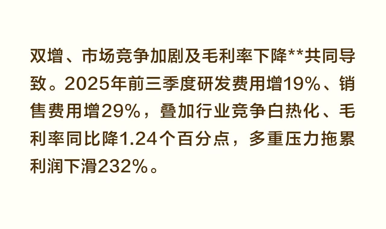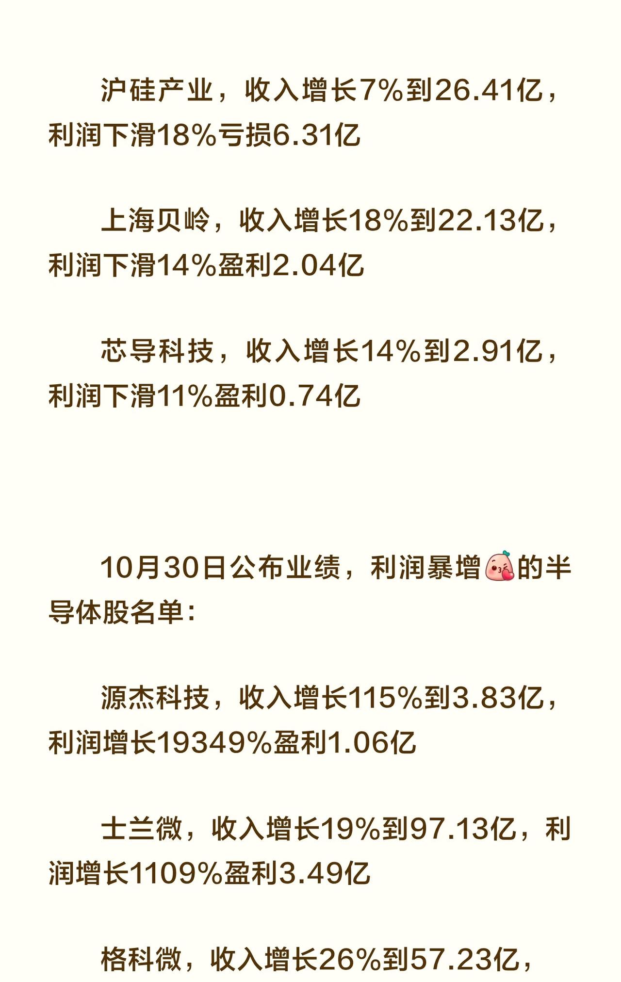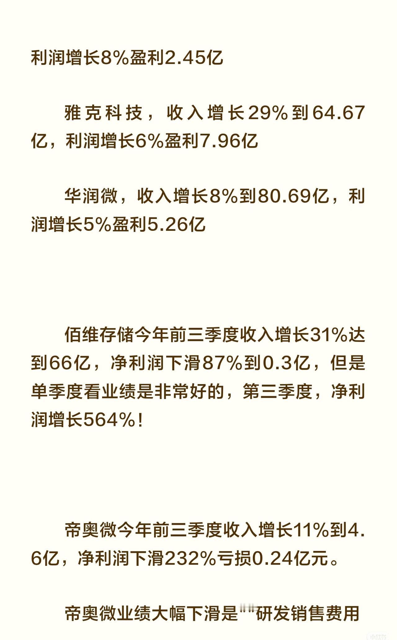 2025年半导体行业上市公司三季报的整体业绩表现,呈现出“大分化”的显著特征,具体如下: 一、总体格局:半导体三季报业绩“大分化” - 核心标题:半导体三季报大分化 - 关键数据对比:16家暴雷(业绩下滑/亏损) vs 26家暴增(业绩高增长) - 亮点举例:存储龙头利润暴增564%(如佰维存储第三季度净利润同比增564%) 二、业绩“暴降/暴雷”企业(利润下滑或亏损) 1. 利润明显下滑或亏损的部分企业(10月30日公布业绩为例): - 欧莱新材:收入+24%(至3.69亿),但利润下滑307%,亏损0.20亿 - 帝奥微:收入+11%(至4.57亿),利润下滑232%,亏损0.24亿(原因提及研发与销售费用较高) - 芯源微:收入-10%(至9.90亿),利润下滑109%,亏损0.10亿 - 德明利:收入+85%(至66.59亿),利润却下滑106%,亏损0.27亿 - 佰维存储:收入+31%(至65.75亿),利润下滑87%,仍盈利0.30亿(但Q3单季净利润暴增564%) - 电科芯片:收入-11%(至6.44亿),利润下滑83%,盈利0.10亿 2. 增收不增利,甚至亏损的企业: - 沪硅产业:收入+7%(至26.41亿),但利润下滑18%,亏损6.31亿 - 气派科技:收入+7%(至5.31亿),利润下滑26%,亏损0.77亿 - 华亚智能:虽收入+80%(至7.73亿),但利润下滑26%,盈利0.49亿 - 中科飞测:收入+48%(至12.02亿),利润下滑亏损0.15亿 - 燕东微:收入+18%(至11.67亿),利润下滑亏损0.13亿 - 拓荆科技虽有收入增长85%(至42.20亿)、利润增长105%(至5.57亿),但也有企业如: - 纳芯微:收入+73%(至23.66亿),但利润下滑亏损1.40亿 - 希荻微:收入+108%(至7.17亿),但利润下滑亏损0.76亿 - 慧智微:收入+48%(至5.68亿),但利润下滑亏损1.22亿 - 芯海科技:收入+20%(至6.15亿),但利润下滑亏损0.63亿 - 路维光电虽利润增长42%(至1.72亿),但也有类似企业面临“增收不增利” 三、业绩“暴增/向好”企业(利润大幅提升) 1. 利润暴增的代表性企业: - 源杰科技:收入+115%(至3.83亿),利润暴增19349%(至1.06亿) - 士兰微:收入+19%(至97.13亿),利润暴增1109%(至3.49亿) - 格科微:收入+26%(至57.23亿),利润数据未完全展示,但也属于利润增长阵营 2. 其他利润大幅增长企业: - 中晶科技:收入持平(3.21亿),利润增长164%(至0.34亿) - 博通集成:收入+8%(至6.24亿),利润增长127%(至0.09亿) - 有研新材:收入持平(67.70亿),利润增长114%(至2.45亿) - 拓荆科技:收入+85%(至42.20亿),利润增长105%(至5.57亿) - 澜起科技:收入+58%(至40.58亿),利润情况未完整展示,但属于增长组 3. 稳健或高增长代表: - 北方华创:收入+33%(至273.01亿),利润增长15%(至51.30亿) - 华海清科:收入+30%(至31.94亿),利润增长10%(至7.91亿) - 雅克科技:收入+29%(至64.67亿),利润增长6%(至7.96亿) - 华润微:收入+8%(至80.69亿),利润增长5%(至5.26亿) - 宏微科技:收入持平(9.83亿),利润增长33%(至0.05亿) - 汇成股份:收入+21%(至12.95亿),利润情况未完全展示 - 清溢光电:收入+12%(至9.28亿),利润增长19%(至1.44亿) - 翱捷科技:收入+13%(至28.80亿),利润增长20%(但仍有亏损3.27亿) - 杰华特:收入+63%(至19.42亿),利润增长9%(但仍有亏损4.60亿) - 裕太微:收入+46%(至3.88亿),利润增长9%(但仍有亏损1.28亿) - 珂玛科技:收入+29%(至7.94亿),利润情况未完全展示 四、行业共性挑战(影响企业利润的重要因素) - 多重压力导致利润下滑: - 2025年前三季度,行业整体面临: - 研发费用增长19% - 销售费用增长29% - 行业竞争进入白热化 - 毛利率同比下降1.24个百分点 - 综合结果:企业利润被多重因素拖累,部分企业利润大幅下滑232% - 典型现象:即使收入增长(如帝奥微+11%、佰维存储+31%、德明利+85%等),但由于研发投入加大、销售费用上升、价格战等因素,利润反而大幅下滑甚至亏损。