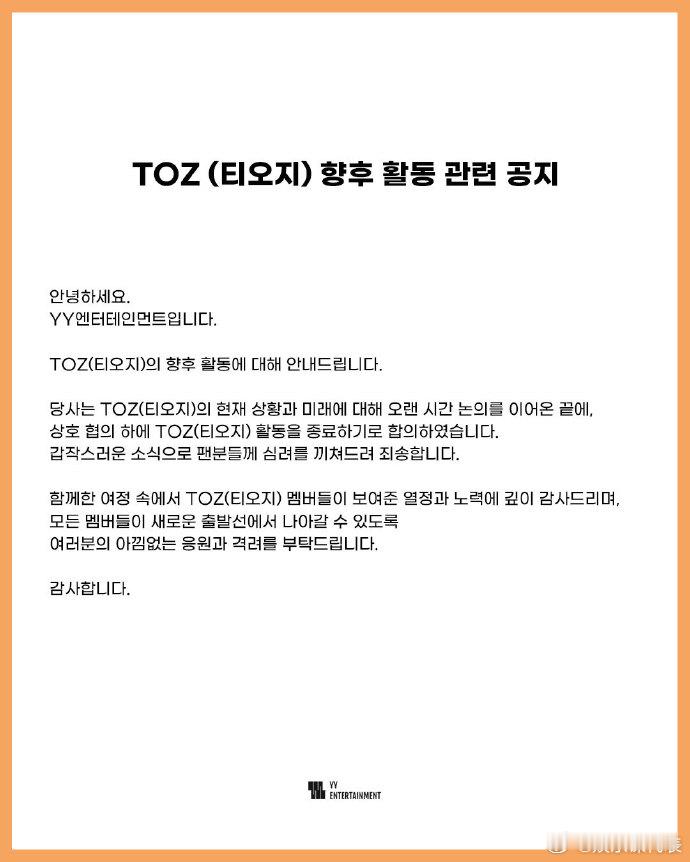 TOZ解散 据韩媒,组合TOZ公告宣布解散。TOZ宣布解散