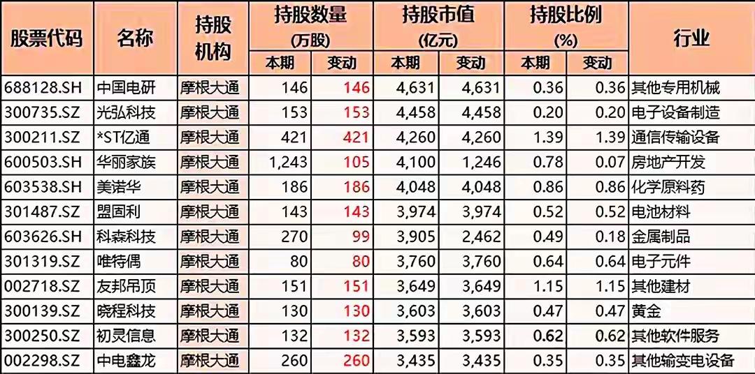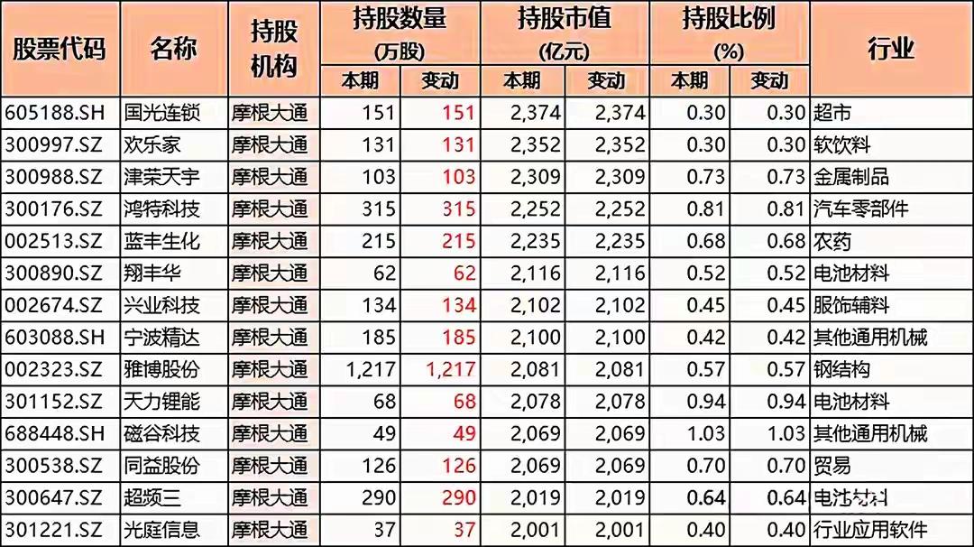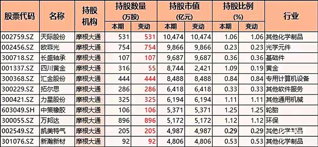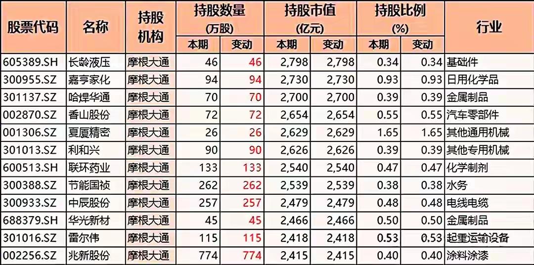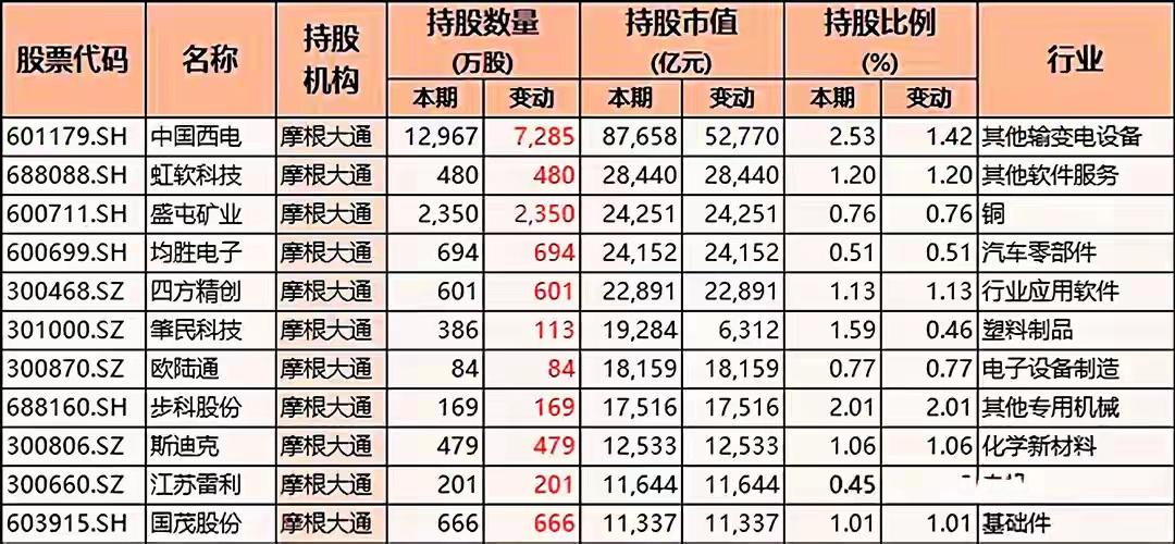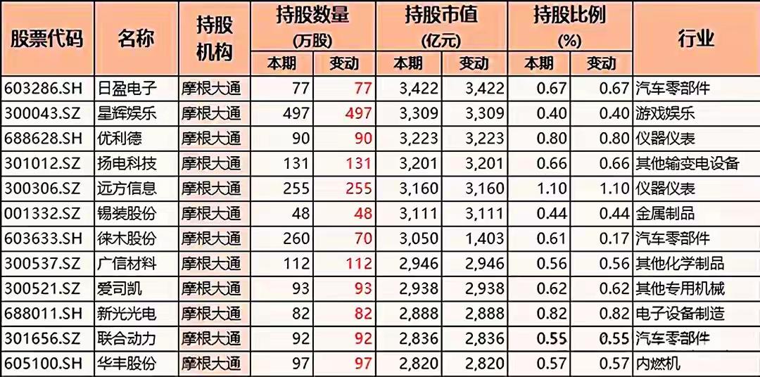 多只A股股票被摩根大通(JPMorgan Chase)这一机构所持有的详细情况,包括: 一、核心信息汇总 1. 持股机构 所有表格中的“持股机构”均为 摩根大通(JPMorgan Chase Bank, N.A. 或简称 JPMorgan),说明这是关于同一国际金融机构在A股市场的持股披露或分析。 2. 表格结构(每张图基本一致) 每张表格均包含如下字段(列)信息: - 股票代码(如 601179.SH、002759.SZ 等):代表具体的A股上市公司。 - 名称:上市公司中文名称,如中国西电、天际股份、日盈电子等。 - 持股机构:统一为摩根大通。 - 持股数量(万股):分为“本期”和“变动”两列,反映当前持股数量及与上期相比的增减。 - 持股市值(亿元):同样分为“本期”和“变动”两列,表示当前持股对应的市场价值及其变化。 - 持股比例(%):本期持股比例,有些表格还包含变动值。 - 行业:股票所属的细分行业,如“其他输变电设备”、“汽车零部件”、“电子设备制造”、“塑料制品”、“化学新材料”、“基础件”、“游戏娱乐”、“软饮料”等。 3. 股票覆盖范围广泛,涉及多个行业 这些表格合计展示了 超过70只不同的A股股票,它们分属于以下典型行业(不完全列举): (1)电力设备 / 输变电 - 中国西电(601179.SH)【其他输变电设备】—— 持股数量变动极大:+7285万股,市值变动+527.70亿元(表格中以红色高亮显示) (2)软件与信息技术 - 虹软科技(688088.SH)【其他软件服务】 - 四方精创(300468.SZ)【行业应用软件】 - 拓尔思(300229.SZ) - 新瀚新材(301076.SZ) - 新光光电(688011.SH) (3)半导体 / 光学电子 - 欧菲光(002456.SZ)【光学光电子】 - 优利德(688628.SH) - 新光光电(688011.SH) - 联合动力(301656.SZ) (4)有色 / 矿业 - 盛屯矿业(600711.SH)【铜】 - 四川黄金(001337.SZ)【贵金属 / 黄金】 (5)汽车及零部件 - 均胜电子(600699.SH)【汽车零部件】 - 日盈电子(603286.SH)【汽车零部件】 - 星辉娱乐(300043.SZ)【游戏娱乐,但持股信息中也出现】 - 扬电科技(301012.SZ) - 中辰股份(301319.SZ) (6)电子制造 / 设备 - 肇民科技(301000.SZ)【塑料制品】 - 欧陆通(300870.SZ)【电子设备制造】 - 长龄液压(605389.SH)【基础件】 - 哈焊华通(301137.SZ) - 利和兴(301013.SZ) - 雷尔伟(301016.SZ) - 兆新股份(002256.SZ) (7)化工 / 材料 - 斯迪克(300806.SZ)【化学新材料】 - 凯美特气(002549.SZ) - 万邦达(300055.SZ) - 广信材料(300521.SZ) - 远方信息(300306.SZ) (8)医药生物 - 联环药业(600513.SH) - 华光新材(688379.SH) - 节能国祯(300933.SZ) - 嘉亨家化(300955.SZ) (9)机械设备 - 力星股份(300421.SZ) - 天力锂能(301152.SZ) - 津荣天宇(300988.SZ) - 鸿特科技(002513.SZ) (10)食品饮料 / 商业零售 - 欢乐家(300997.SZ)【软饮料】 - 国光连锁(605188.SH)【超市/零售】 - 津荣天宇(300988.SZ) (11)其他制造业 / 综合 - 中国电研(688128.SH) - *ST亿通(300211.SZ) - 友邦吊顶(002718.SZ) - 晓程科技(300139.SZ) - 初灵信息(300250.SZ) - 中电鑫龙(002298.SZ) - 兴业科技(002674.SZ) - 宁波精达(603088.SH) - 雅博股份(002323.SZ) - 磁谷科技(688448.SH) - 同益股份(300538.SZ) - 超频三(300647.SZ) - 光庭信息(301221.SZ)