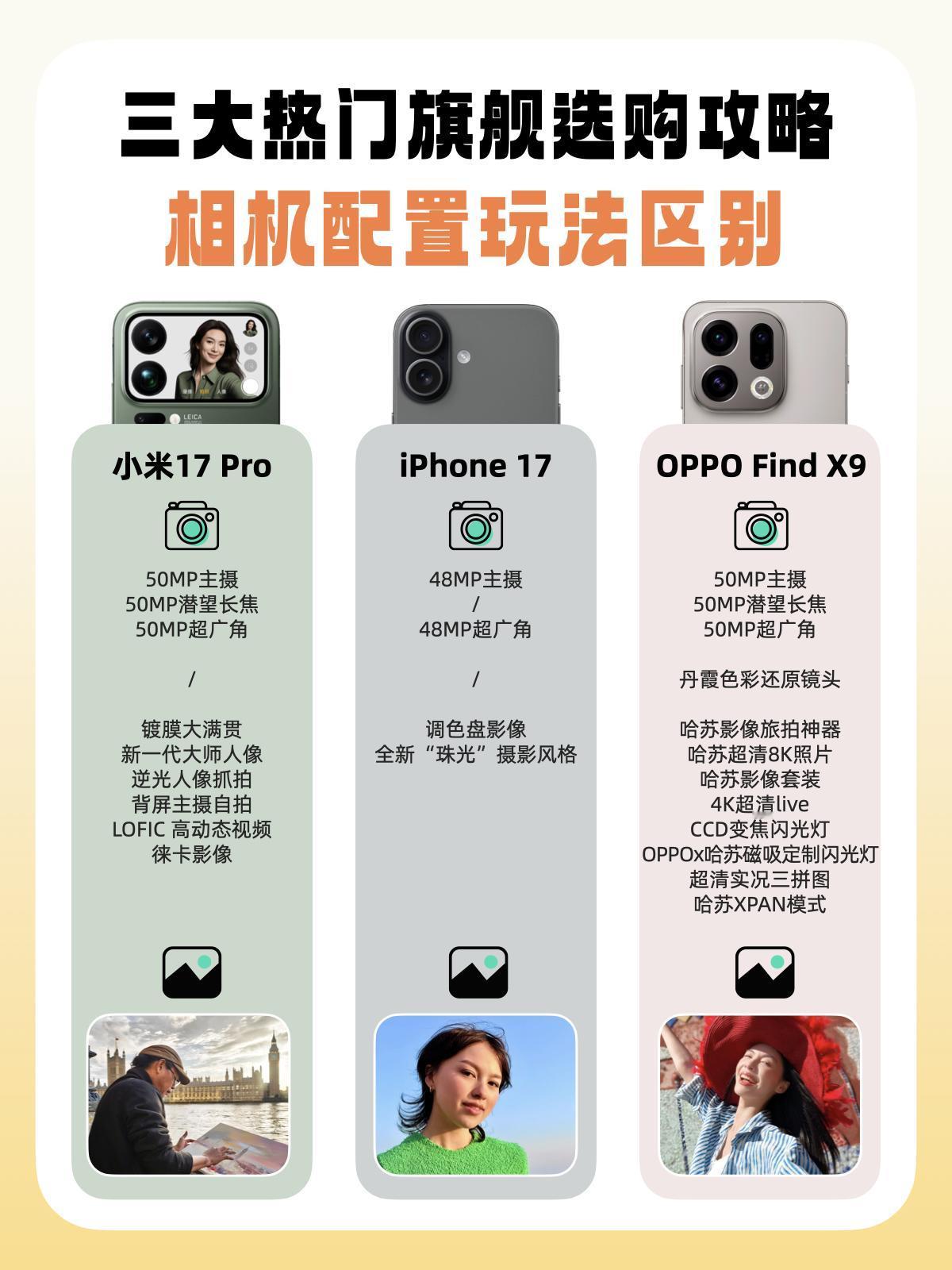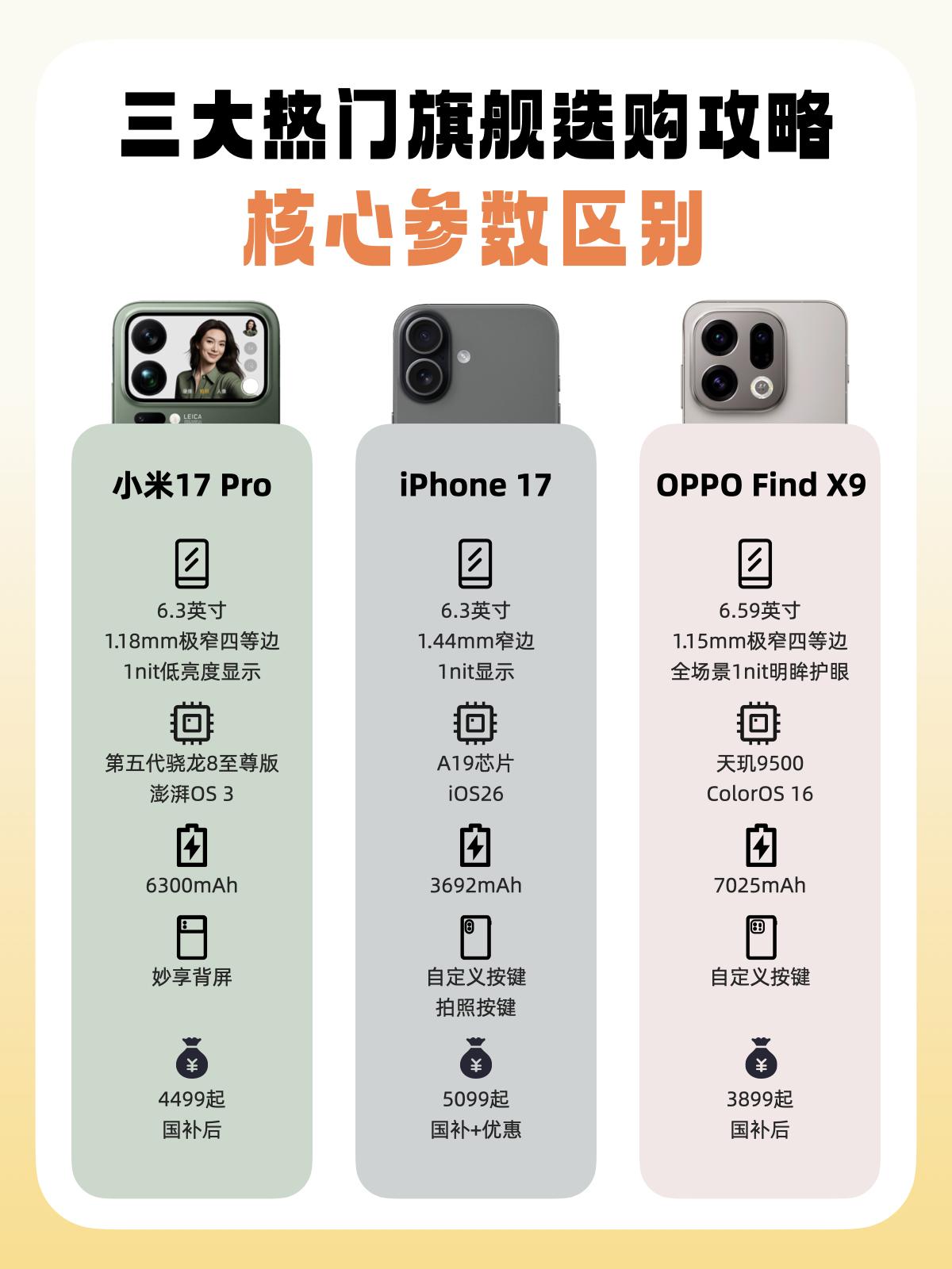 双十一换机关注性价比?🔥三大旗舰这么选! 最近翻了好几天攻略,跑去某夕夕看了价格,现在国补和活动一叠加,价格真的触底了👇 ✨ OPPO Find X9(国补后 3899 起) 拍照党直接锁死它!哈苏影像拍人像超绝,Ultra级丹霞色彩还原镜头可以把肤色调得巨自然,4K live 图放大看细节都清清楚楚。关键是 7025mAh 大电池,周末出去玩拍一天 vlog,晚上还有电!某夕夕国补后 3899 起,这价格配哈苏影像,香到跺脚! 📸 小米 17 Pro(国补后 4499 起) 徕卡影像拍风光绝绝子,逆光人像也能抓得很清晰。6300mAh 电池续航,一天一充完全够。某夕夕国补后 4499 起,想体验徕卡色彩的冲它! 🍎 iPhone 17(国补 + 优惠后 5099 起) 苹果党闭眼入!新的 “珠光” 摄影风格拍人像很有质感,系统丝滑度没话说。某夕夕叠加国补和活动后 5099 起,现在入手比官网香太多! 综合下来,这三台各有各的香,拍照、续航、系统需求不同的姐妹都能找到本命! 2025年度三大旗舰怎么选 三大热门旗舰选购攻略 双十一手机推荐 OPPOFindX9 小米17Pro iPhone17 性价比之王 手机摄影