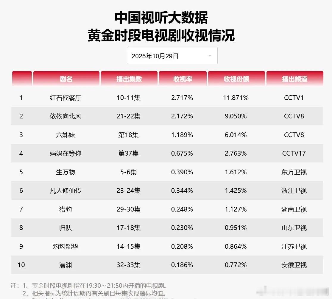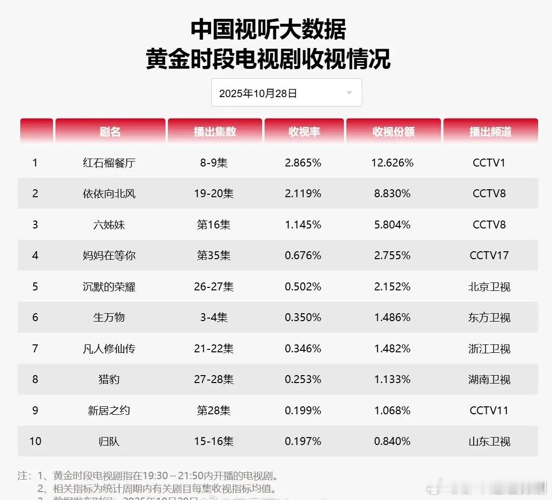 【2025年10月28/29日中国视听大数据CVB黄金档电视剧收视率日榜TOP10】