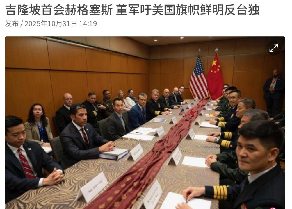 中美举行防长级会晤,中方表态霸气!我方放严正表态,要求美国立场鲜明的反对“台独”!10月31日,中美防长在吉隆坡首次举行面对面会谈。面对我方国防部长,美国国防部长赫格塞思表示,美国对北京在南中国海、台湾周边地区活动,以及针对美国在印太地区的盟友和伙伴的关切。 赫格塞思嘴里喊着 “不寻求冲突”,强调要 “捍卫地区利益”,这话听着挺冠冕堂皇,但结合他们的实际行动一对照,就知道满是水分。毕竟这种 “说一套做一套” 的操作,美方这些年玩得可太熟练了。 先说说台湾问题上美方的 “小动作”,这可不是空口白话。拜登任内对台军售总额都快摸到 77 亿美元了,特朗普时期更夸张,光 2017 到 2021 年就批了 11 笔,总额 183.3 亿美元,其中那笔 66 架 F-16V 战机的订单就值 80 亿美元。 到 2025 年初,美国拖欠台湾的武器订单总额都飙到 215 亿美元了,收了钱不交货,把台湾当成 “提款机” 不说,还美其名曰帮着打造 “不对称战力”。 更讽刺的是,2025 年 10 月美国参院还通过了 “豪猪战略法案”,简化对台军售程序,摆明了要把台湾绑上自己的战车。 台湾当局为了买这些 “过期武器”,举债都快把民众压垮了,截至 2025 年 8 月,台湾中央政府公共债务余额快到 5.9 万亿新台币,人均 25.6 万,46 年都未必能还清,这就是美方口中 “维护利益” 的真相。 咱们国防部长董军那句 “台海两岸统一是不可阻挡的历史大势”,可不是喊口号,背后全是实打实的实力支撑。 2024 年 7 月 10 日到 11 日,解放军一天就出动 66 架军机和 7 艘军舰在台岛周边活动,56 架次战机越过所谓 “海峡中线”,形成 “三面围台”,最近距离鹅銮鼻才 33 海里。 台军公布的监控画面模糊得没法看,只能说明他们根本没能力近距离应对,所谓的 “监控” 不过是自欺欺人。 同年,山东舰航母编队带着 055 型驱逐舰延安舰等主力舰艇,直接开到台湾东部的菲律宾海演训,正好和台军 “汉光 40 号” 演习撞期,这就是最直接的威慑,告诉各方谁才是台海真正的主导者。 再看南海,美方同样没闲着,总以 “航行自由” 为借口派军机军舰滋扰,但每次都被咱们精准拿捏。 2023 年美军在南海就被拦截超 100 次,其中歼 11 战机的参与率超过 60%,当年 5 月歼 11 逼近美军 RC-135 侦察机,2023 年 10 月更是在夜间环境下距美军 B-52 轰炸机 3 米内伴飞,逼得美机不得不调整航向。 到 2025 年,歼 11 的拦截记录都超 200 次了,从 2001 年撞机事件时的装备落后,到现在能精准操作逼退美军机,这背后的实力增长就是咱们表态硬气的底气。 美方嘴上关切南海,实际是想靠军事存在搅乱局势,可面对咱们梯次分明的防御体系,那些所谓的 “威慑” 根本不管用。 这次会谈是中美两军两个月内第二次沟通,频率不算低,但美方的态度始终没变,赫格塞思提了半天 “印太盟友”“力量平衡”,本质就是想拉着盟友牵制中国。 可他们忘了,现在的中国早就不是能被随便拿捏的了。美军在台海周边的每一次挑衅,都会换来解放军更密集的演训;对台军售的每一笔订单,都只会让台湾民众的负担更重。 咱们说 “中美可以相互成就”,是给美方留了余地,但 “谨言慎行反对台独” 的红线划得清清楚楚,这可不是商量的余地。 从对台军售的金额飙升到解放军演训的规模扩大,从南海的拦截记录到航母编队的远海巡航,每一组数据每一个案例都在印证,中方的表态从来不是虚张声势,而美方的 “关切” 不过是维持霸权的借口。 台湾问题是中国核心利益中的核心,美方想靠打 “台湾牌” 牵制中国,到头来只会发现,自己既赚不到想赚的利益,还会把地区局势搅得更紧张。 毕竟统一的大势就像黄河东流,不是谁想挡就能挡住的,美方那些小算盘,在绝对的实力和历史大势面前,终究只是徒劳。
