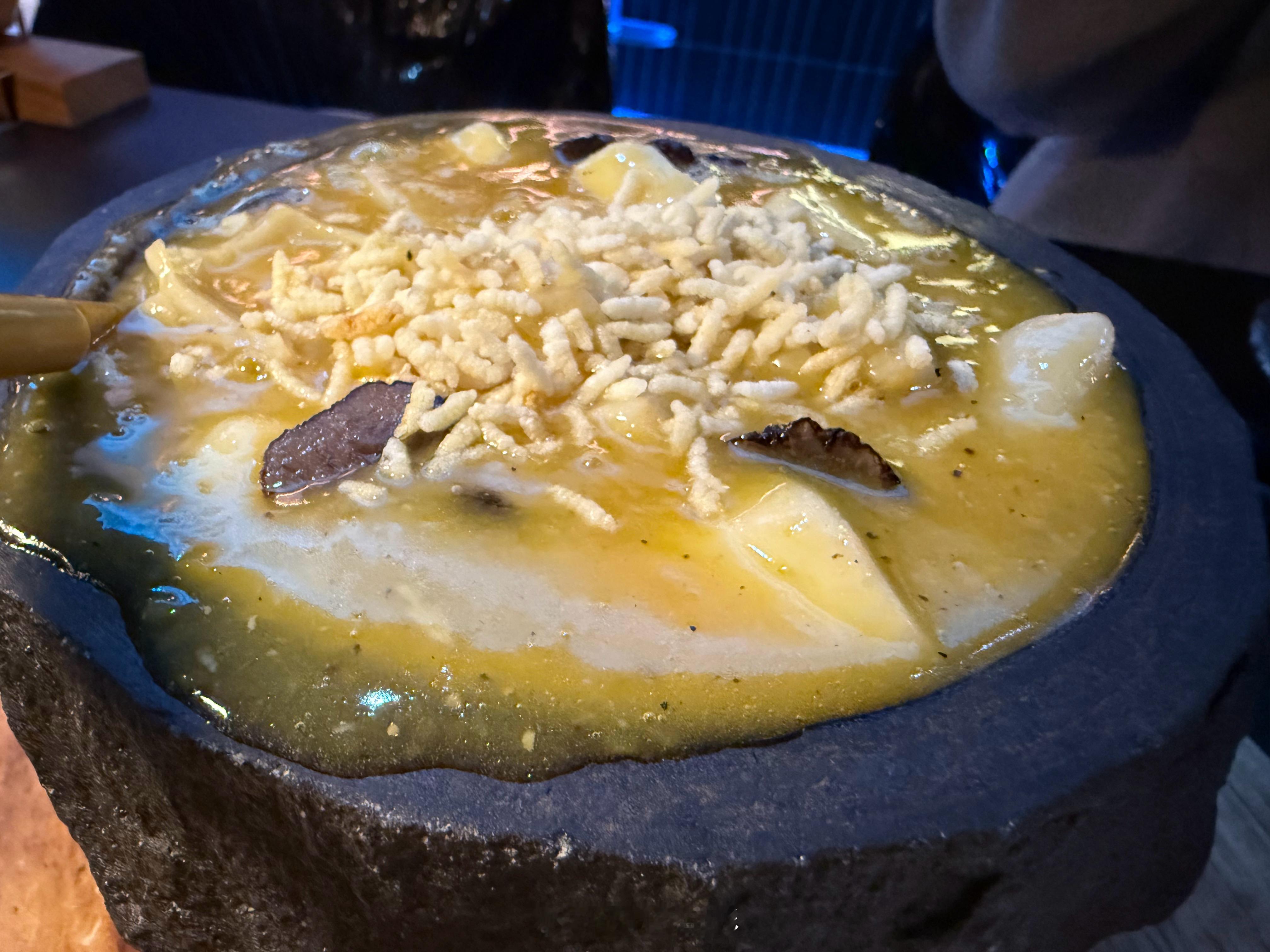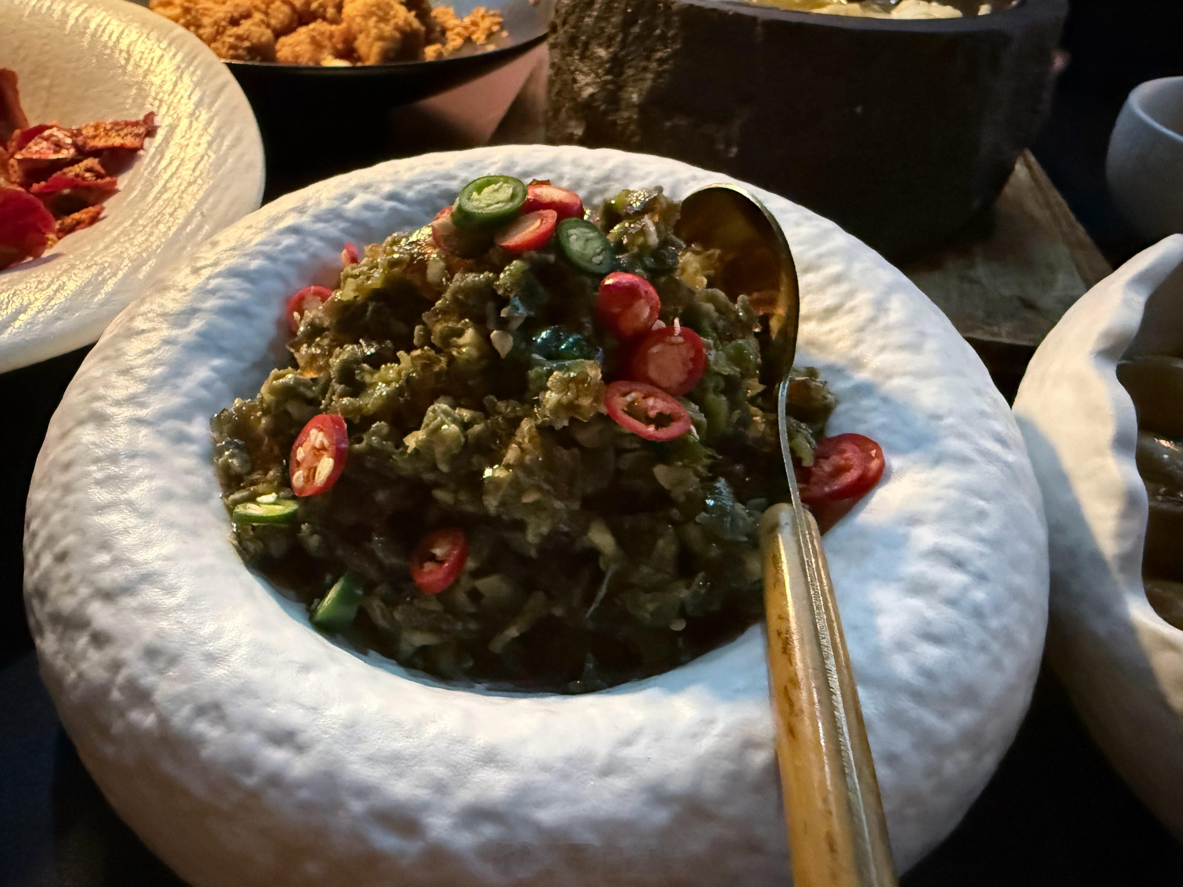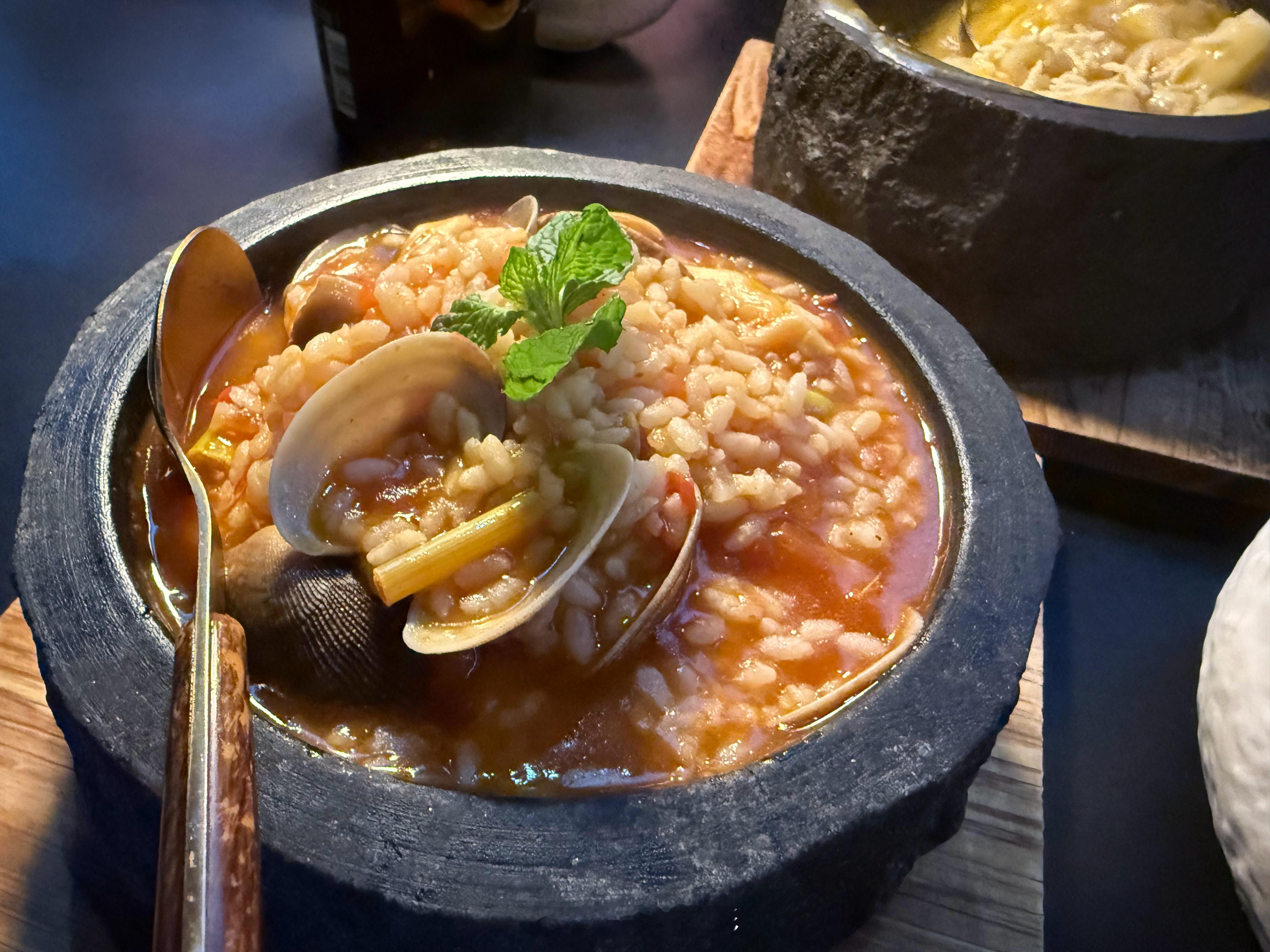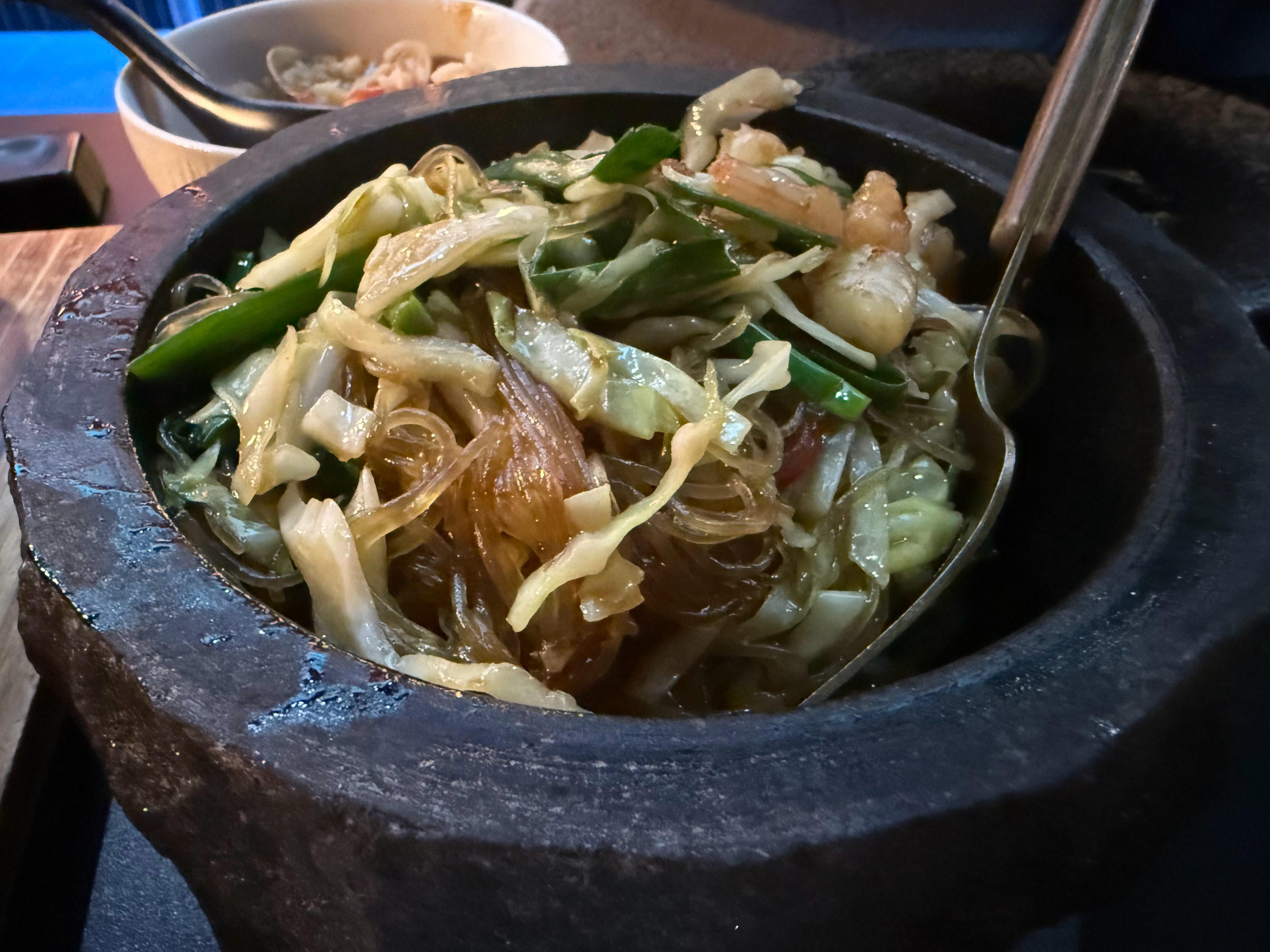 鲍鱼烧鸡,姜丝蛙,山药焖花胶,酸汤海鲜烩饭,辣脑花,红油抄手,虾仁粉丝煲,炸排骨,蒜香掌中宝,烧椒皮蛋……这家店明明以鸡尾酒为主题,我们硬是一点酒没点,光顾着吃了[泪奔]