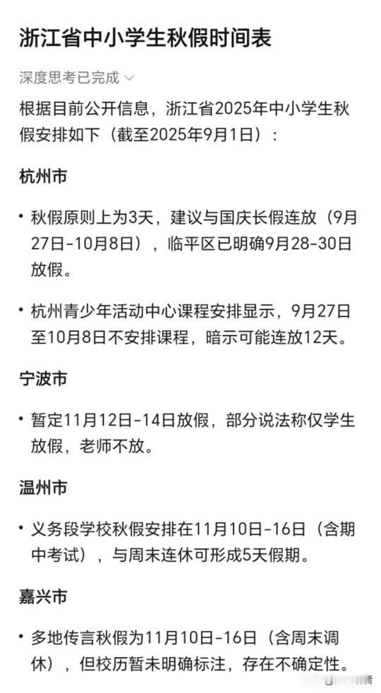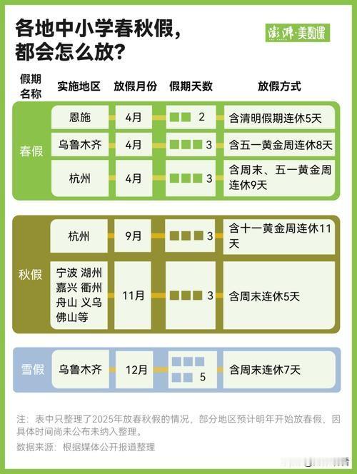 春秋假到底放多久才合理?这答案戳中家长学生的心! 关于春秋假的时长争议也太大了吧!有人说放3天不够玩,有人怕放太长影响学习,到底多久才合适呢?看完各地实践我心里有数了👇 其实现在不少地方已经试行了春秋假,时长各有不同。像四川宜宾、浙江这些地方,春秋假各设3天,再和周末或者法定假日拼一拼,就能凑出5天左右的连休。这时长真的很贴心,学生能好好放松、去户外撒欢或者参加实践活动,又不会让教学进度断层,老师和家长也不用慌着赶课补作业。 广东佛山更灵活,秋假3天、春假2天,春假刚好和五一衔接,短一点也够用,秋假则能让大家在紧张的秋季学期中间喘口气,这种差异化安排也挺合理的。 当然也有地方敢“下猛料”,比如湖北恩施州,春秋假都不少于1周。这对想长途旅行、深度体验社会实践的家庭来说超香,但问题也跟着来——可能得缩短寒暑假,学校调整教学计划麻烦,家长也得头疼怎么安排孩子的托管,确实不太好平衡。 综合来看,3-5天的春秋假真的是黄金时长!再搭配周末或节假日拼出5-7天假期,既能满足大家出门玩、调状态的需求,又不会打乱教学和生活节奏,学校还能趁机组织课外活动。要是能再结合当地气候、学校类型灵活调整,那就更完美啦! 你觉得春秋假放几天最合适?来评论区聊聊吧。