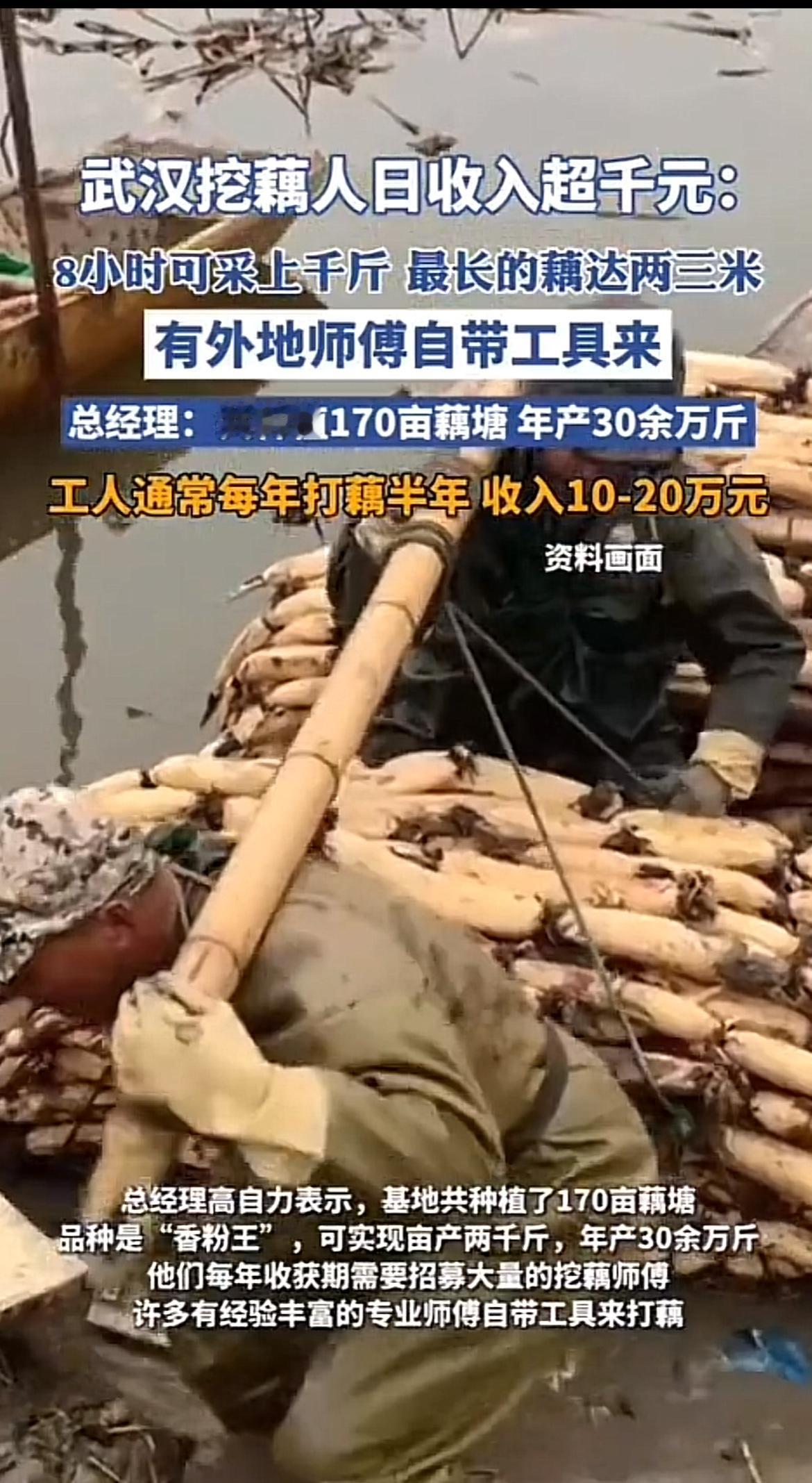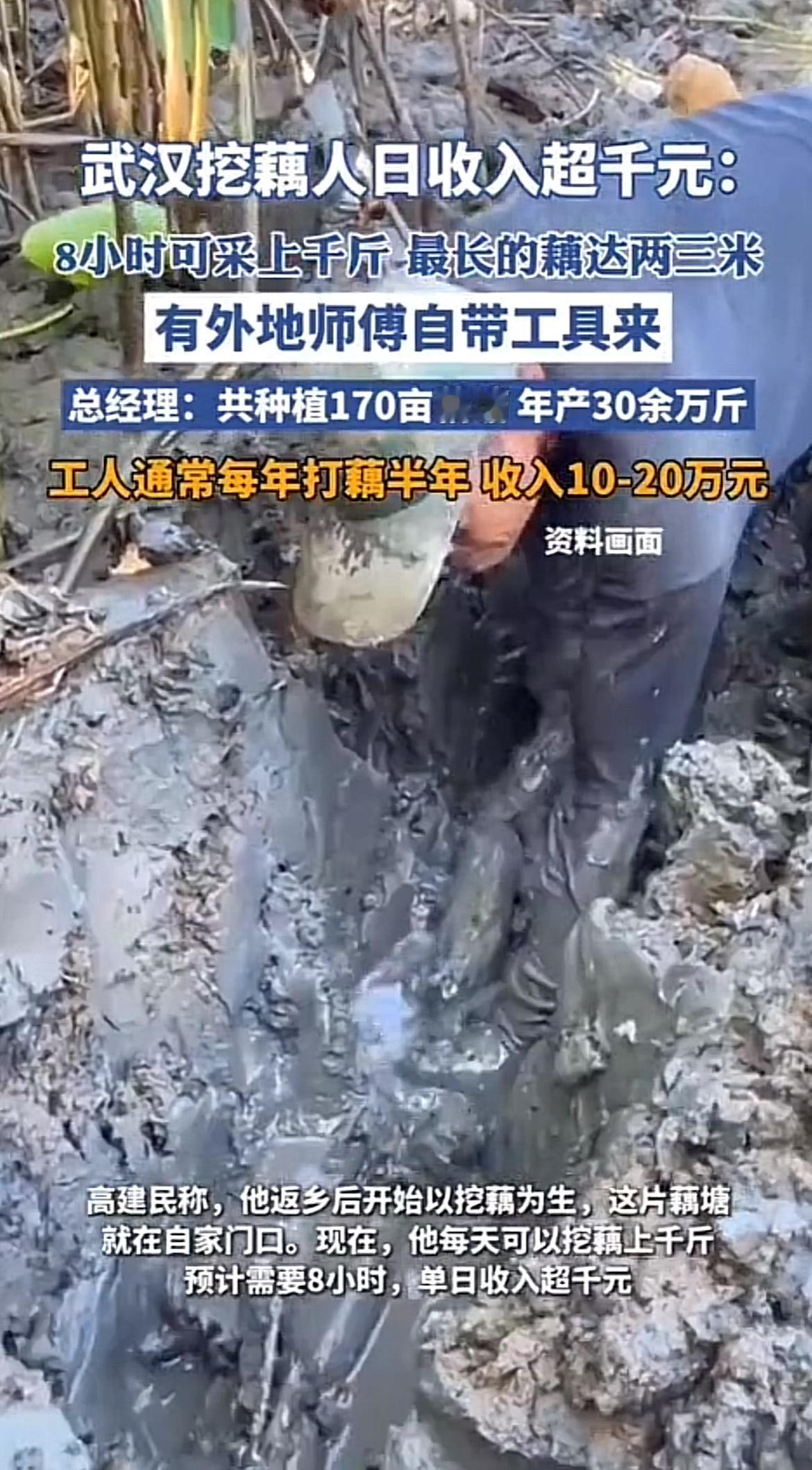 武汉挖藕人日入超千这事太猛了!10月29日,蔡甸种藕基地的挖藕师傅高建民,天没亮就下到齐腰深的冰水泥潭。他弯着腰,一手水枪一手摸藕,两三分钟才能挖出一根,这藕少则一米多则两三米。 高建民每天挖8小时能挖上千斤,日收入超千元。基地总经理说,170亩藕塘种的“香粉王”,亩产两千斤,年产30余万斤。挖藕师傅平均日入上千,约一元一斤,熟练的能挖1500斤,难挖的塘口也有600斤。打藕半年,收入10万到20万,辛苦是真辛苦,但回报也不错!