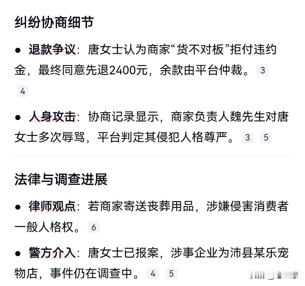 这商家的行为也太恶劣了,不仅虚假宣传,而且还辱骂顾客,竟然还连续三天让女子收到丧葬用品。 卖家图展示的是白色的狗,而实际收到的是颜色很暗淡的狗。 这不就是虚假宣传吗? 近日,店家以顾客违约为由只退2400,还有几百块不退,这是够缺德的。 在平台介入下才退。 后来店家就开顾客寄丧葬用品了。 对于这种情况,可以告这个店主。
