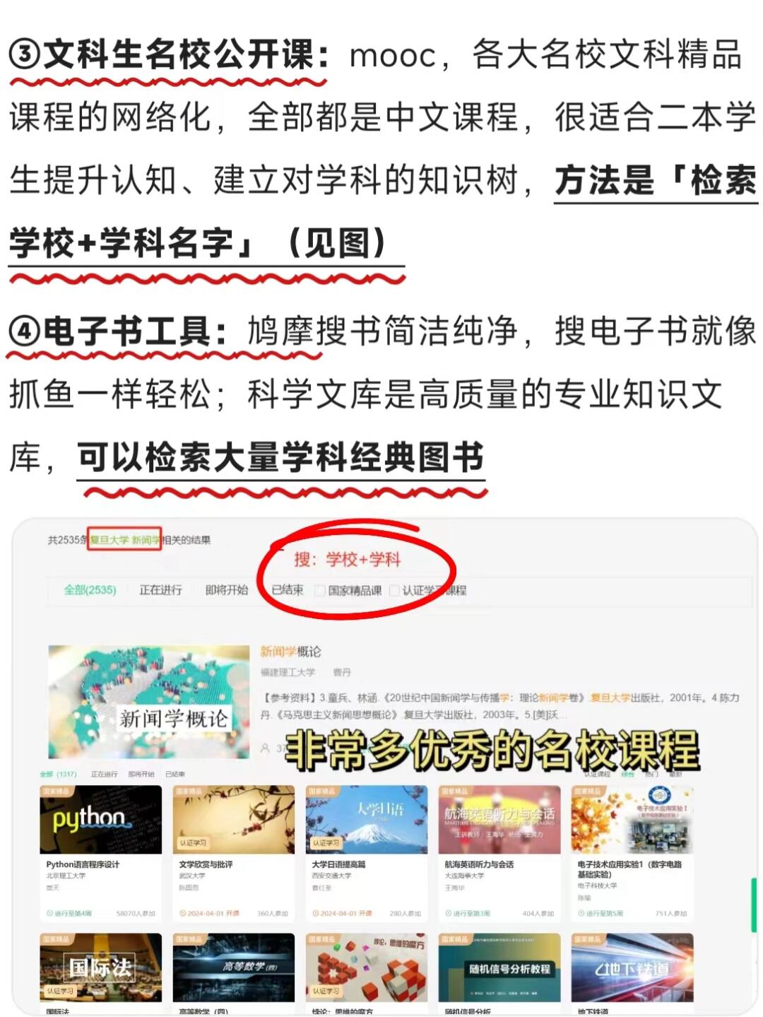 名校文科精品课程网络化,都是中文课程,适合二本学生提升认知、建立对学科的知识树,方法是「检索学校+学科名字」