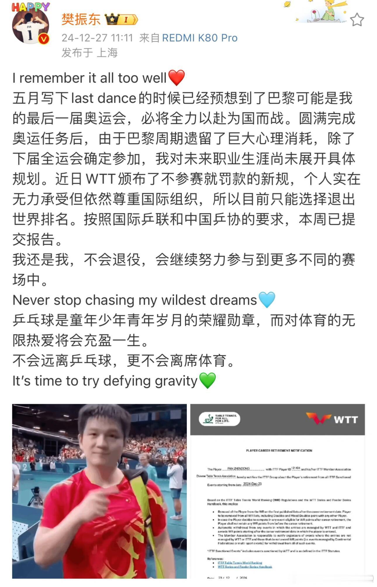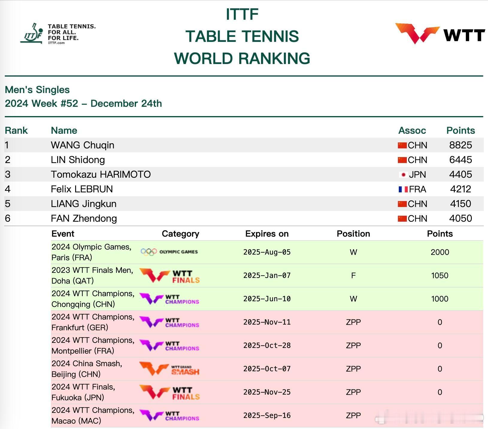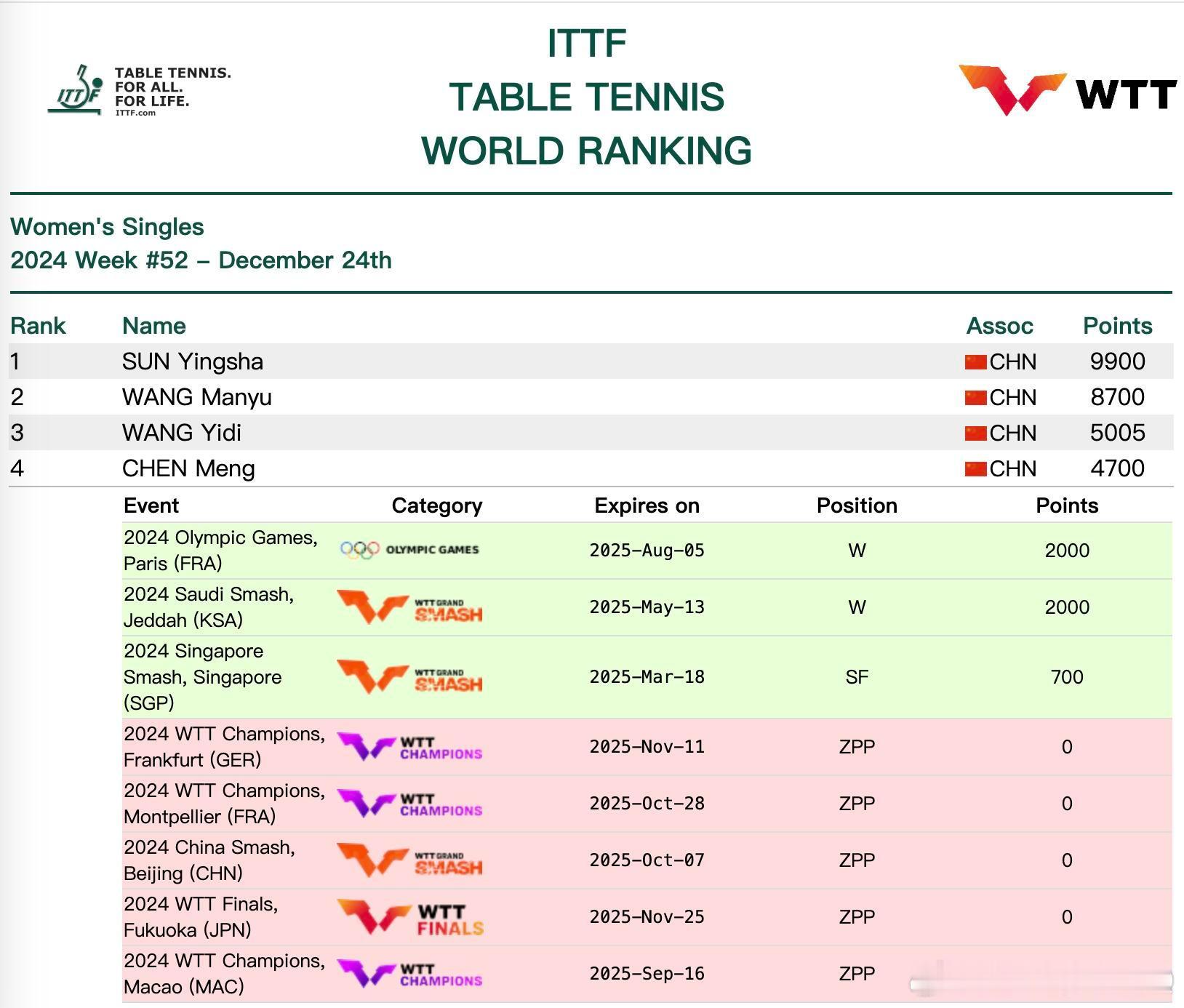 樊振东、陈梦作为巴黎奥运会男女单打冠军,2024年底宣布退出WTT也就没有了世界排名。