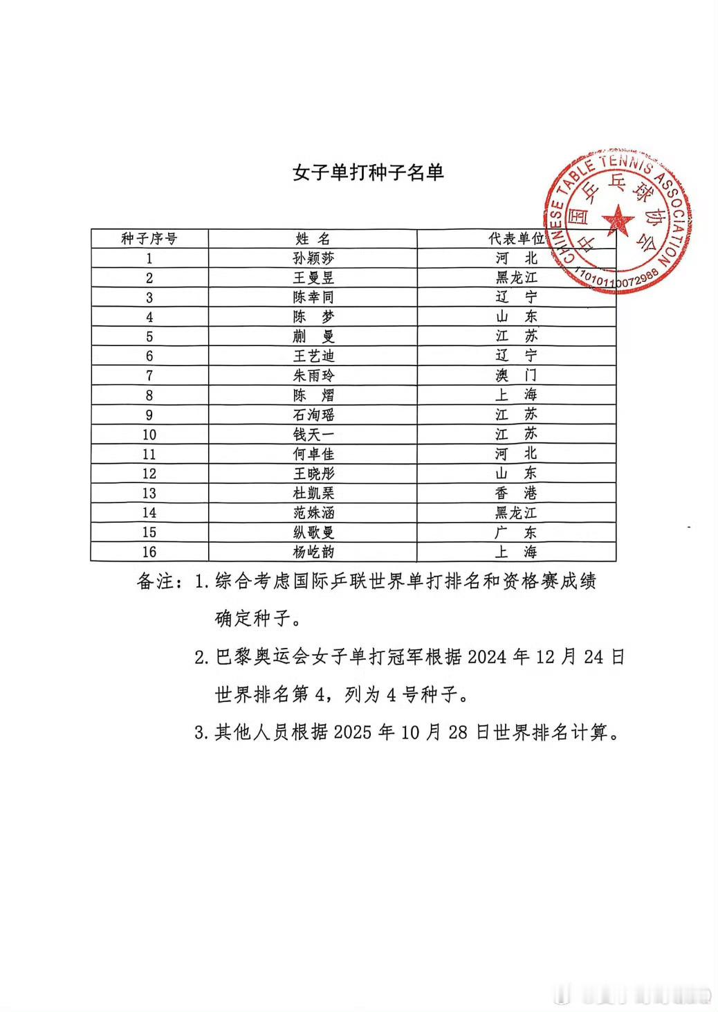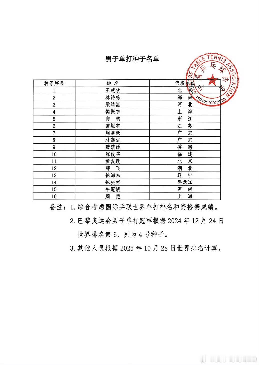 乒协公布全运会乒乓项目种子排序,樊振东、陈梦分别被列为男女单打4号种子。