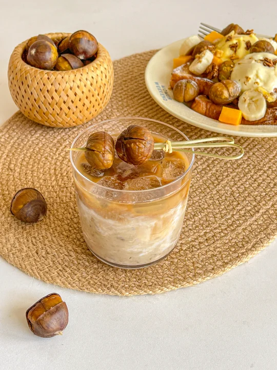 饮品配了杯板栗拿铁 板栗打成泥抹在杯壁上 倒入牛奶咖啡 层次丰富又好看!一口下去 咖啡的微苦和栗子的香甜完美融合 栗子泥还能吃到颗粒感 绵密又扎实😋 关键是薛记烤栗子用了零下38℃锁鲜技术 全年都能拥有这份秋日限定快乐~
