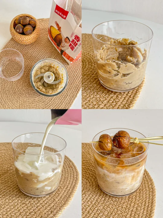 板栗剥壳用破壁机打成泥 抹在杯壁上 放人冰块 倒入牛奶 咖啡液即可