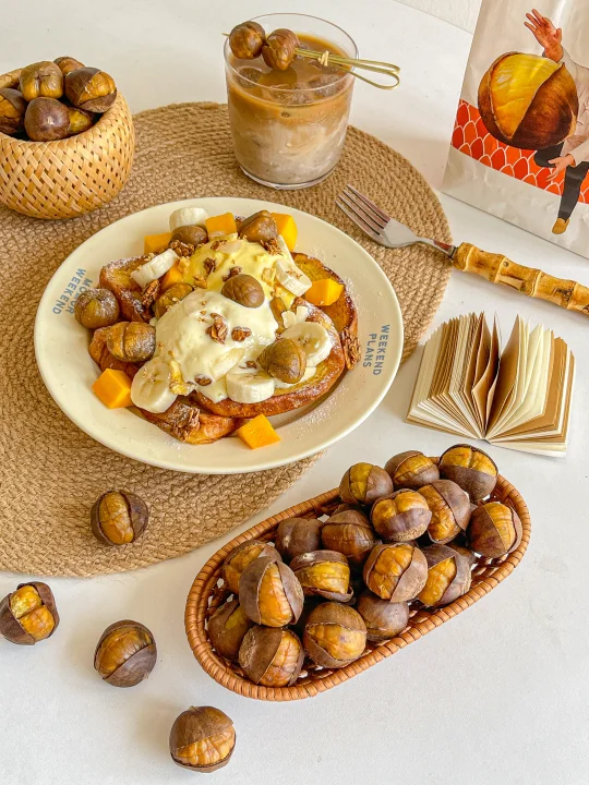 解锁板栗新吃法🌰今天用薛记的锁鲜烤栗子做了一顿秋日下午茶🫖产自燕山山脉的板栗 个个都个头大又饱满 咬一口绵密香甜 22%的自然糖度完全不用额外加糖 做甜品简直绝配!