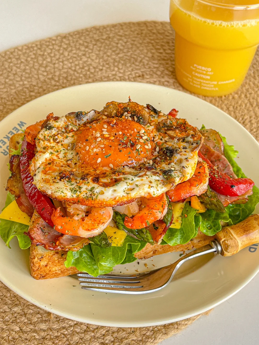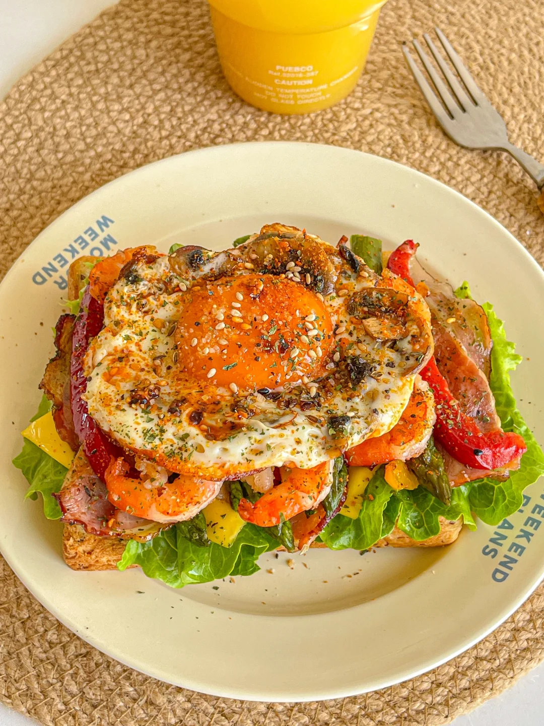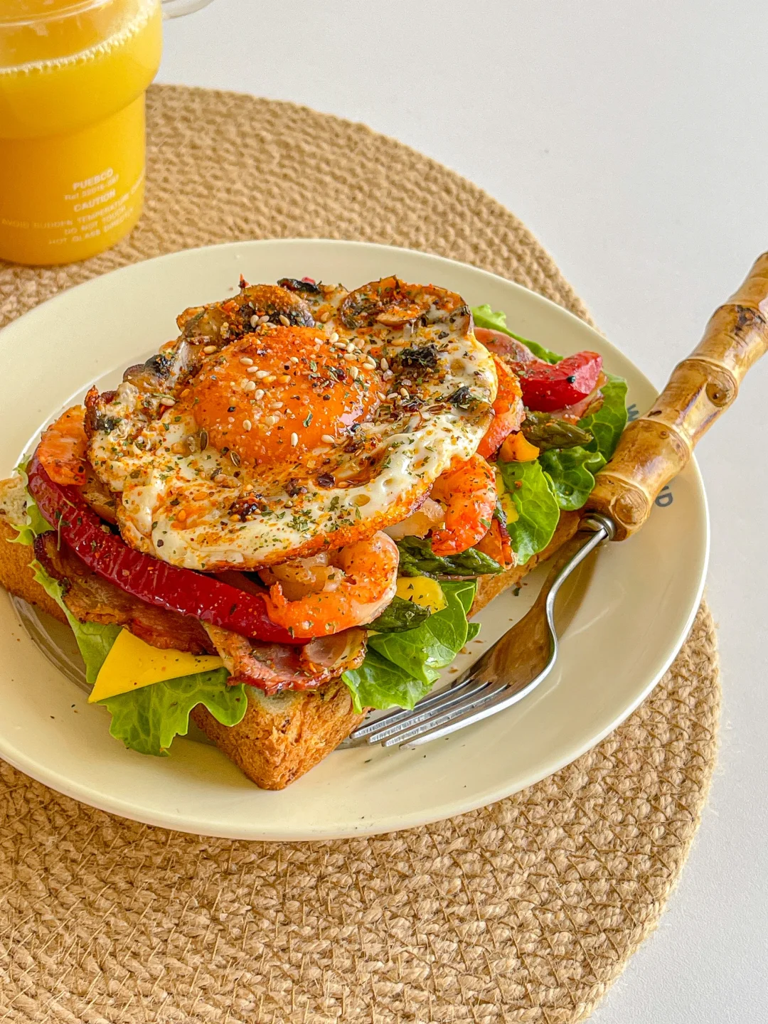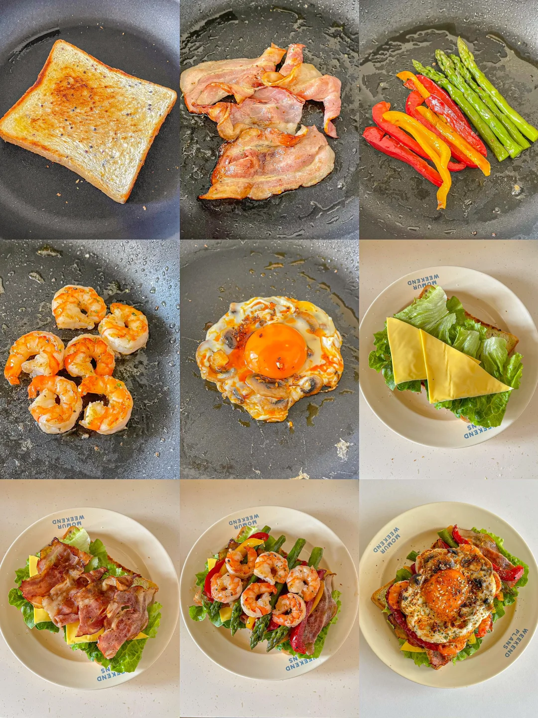 懒人早午餐 巨满足的吐司三明治!🥪 食材:🍞 吐司➕生菜➕芝士片➕培根➕虾仁➕口蘑辣油煎蛋 工作日就简简单单吃一点~不费脑的搭配!有啥搭啥巨好吃😋