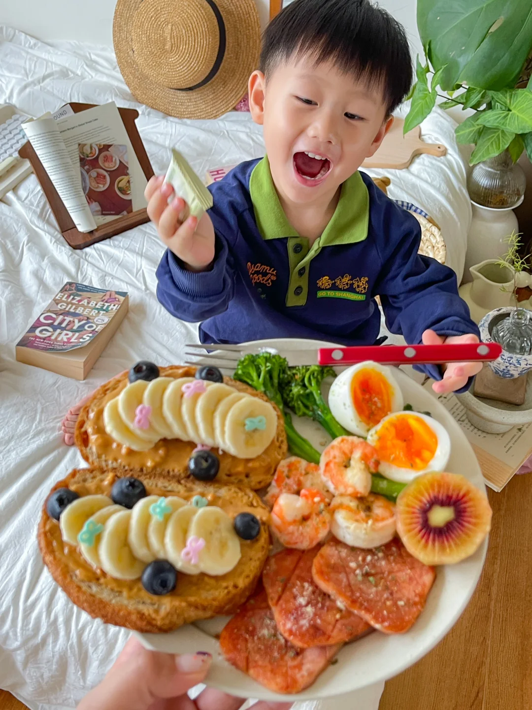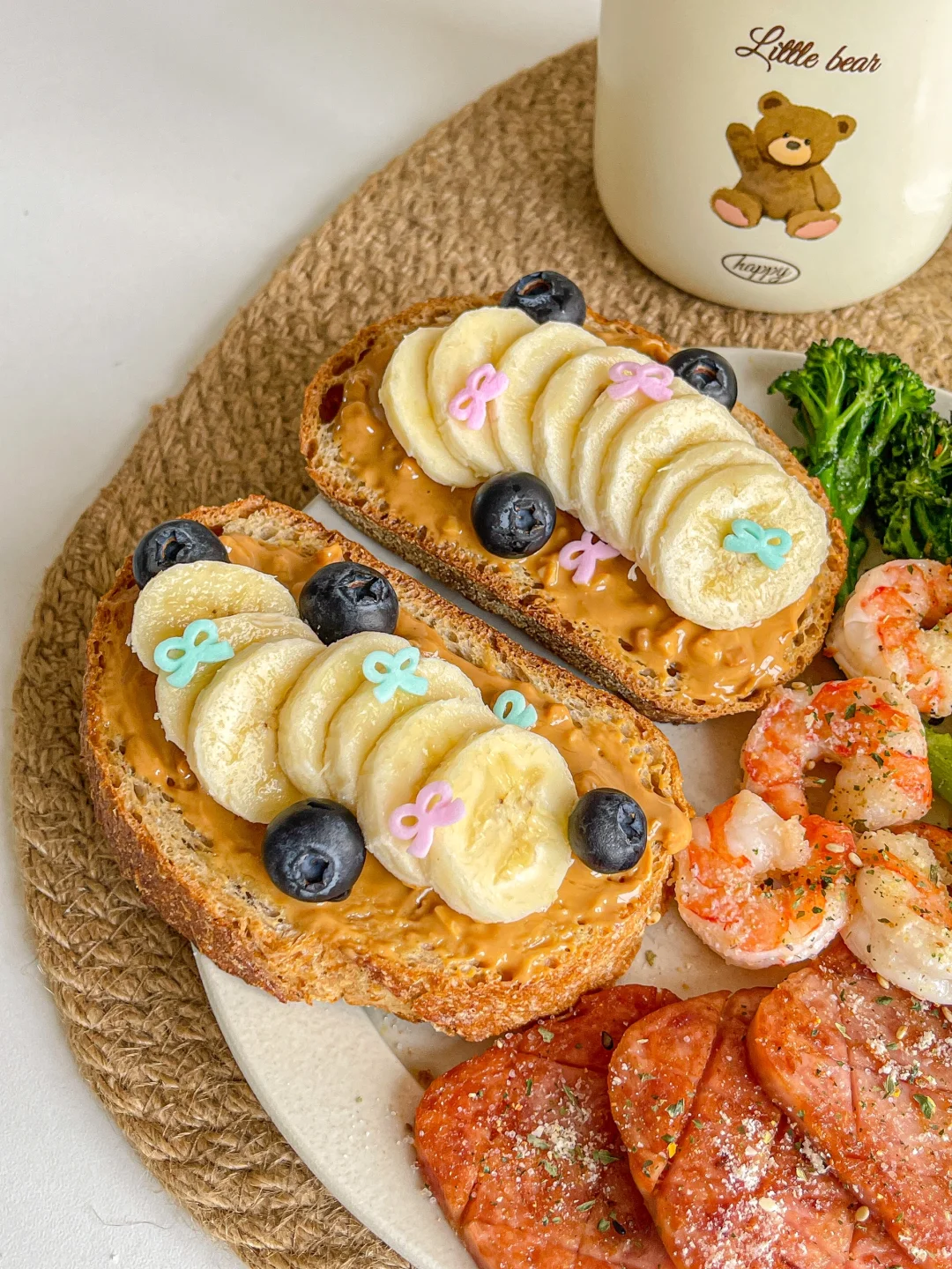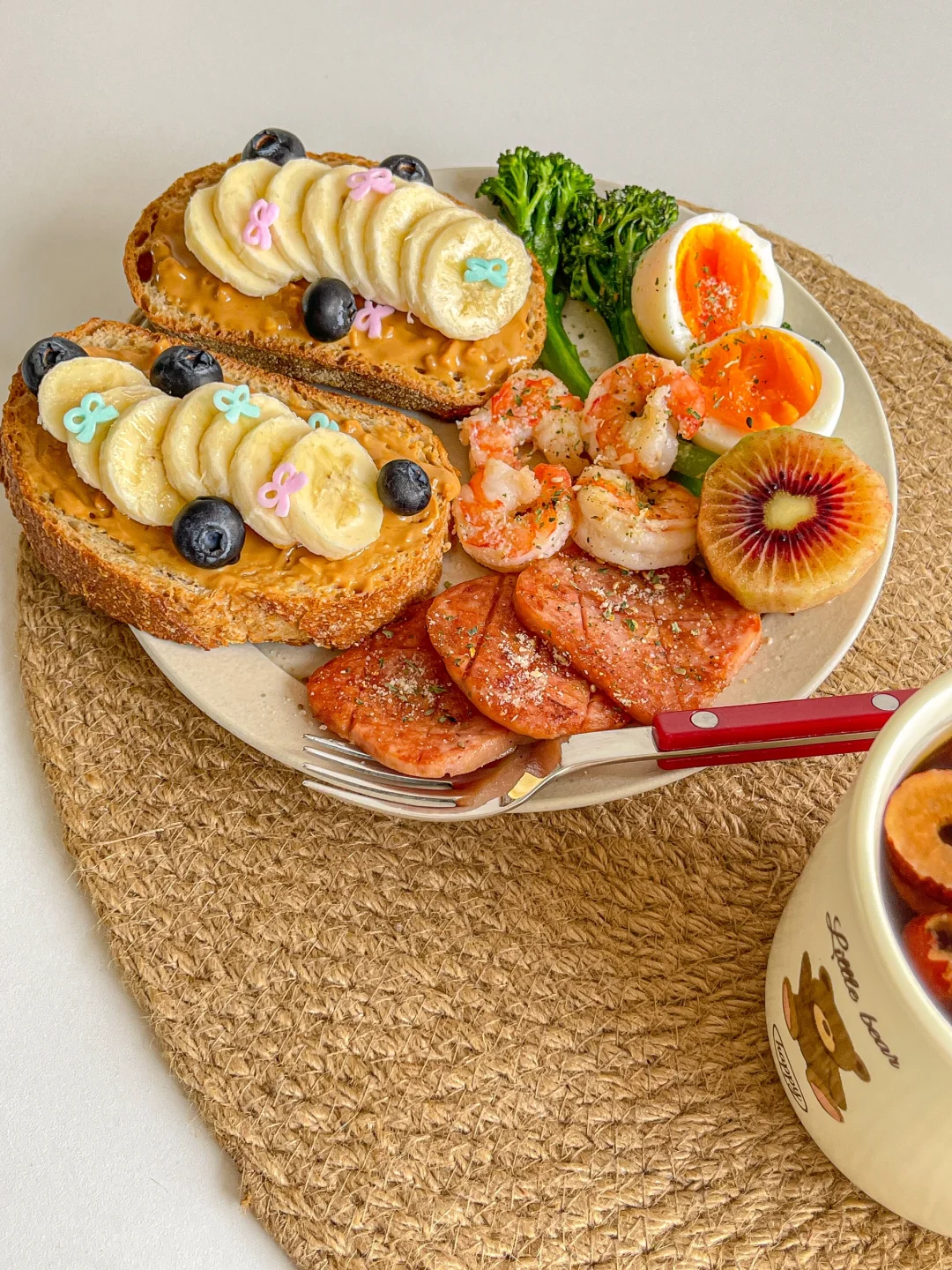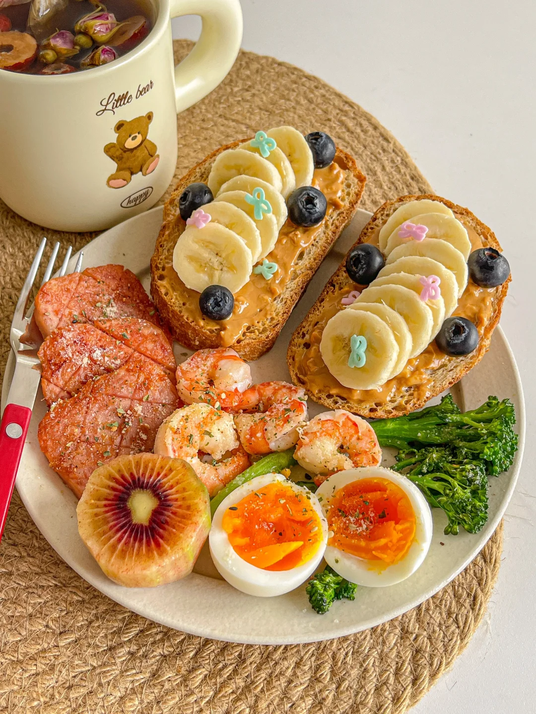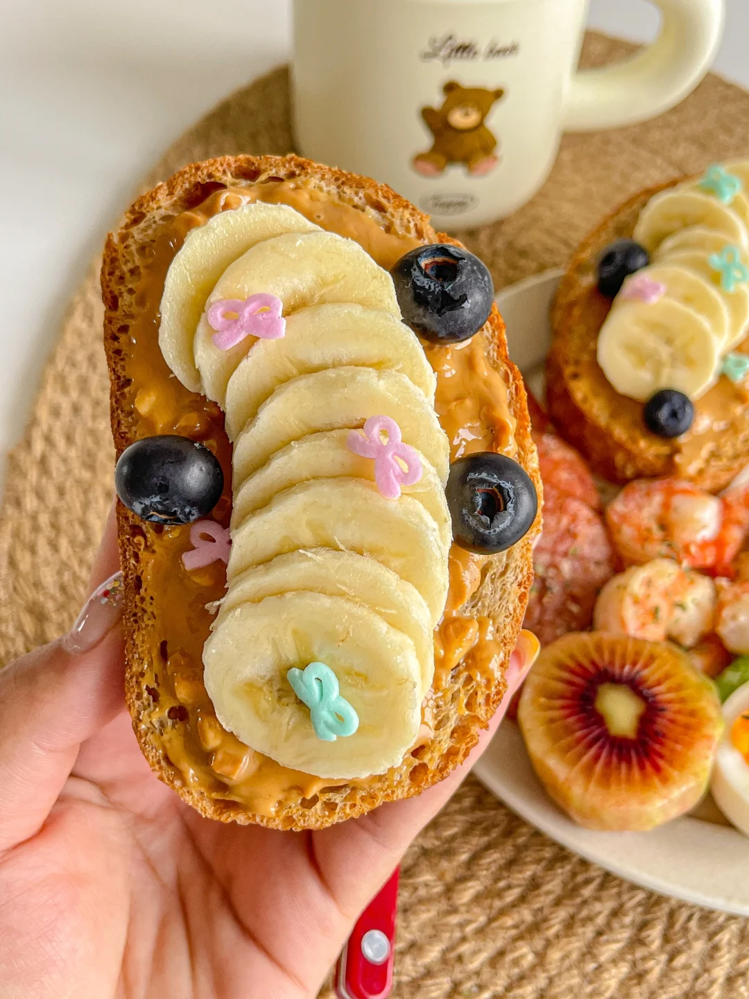 久违的花生酱香蕉三明治! 欧包煎的酥脆 一口下去巨满足! 食材:🥖 欧包➕花生酱➕香蕉➕蓝莓➕午餐肉➕虾仁➕溏心蛋➕西兰苔➕奇异果 简单又美味的一餐 小孩哥迫不及待要开动了!杂粮欧包搭配浓郁的花生酱粉甜甜的香蕉🍌好吃到转圈圈!