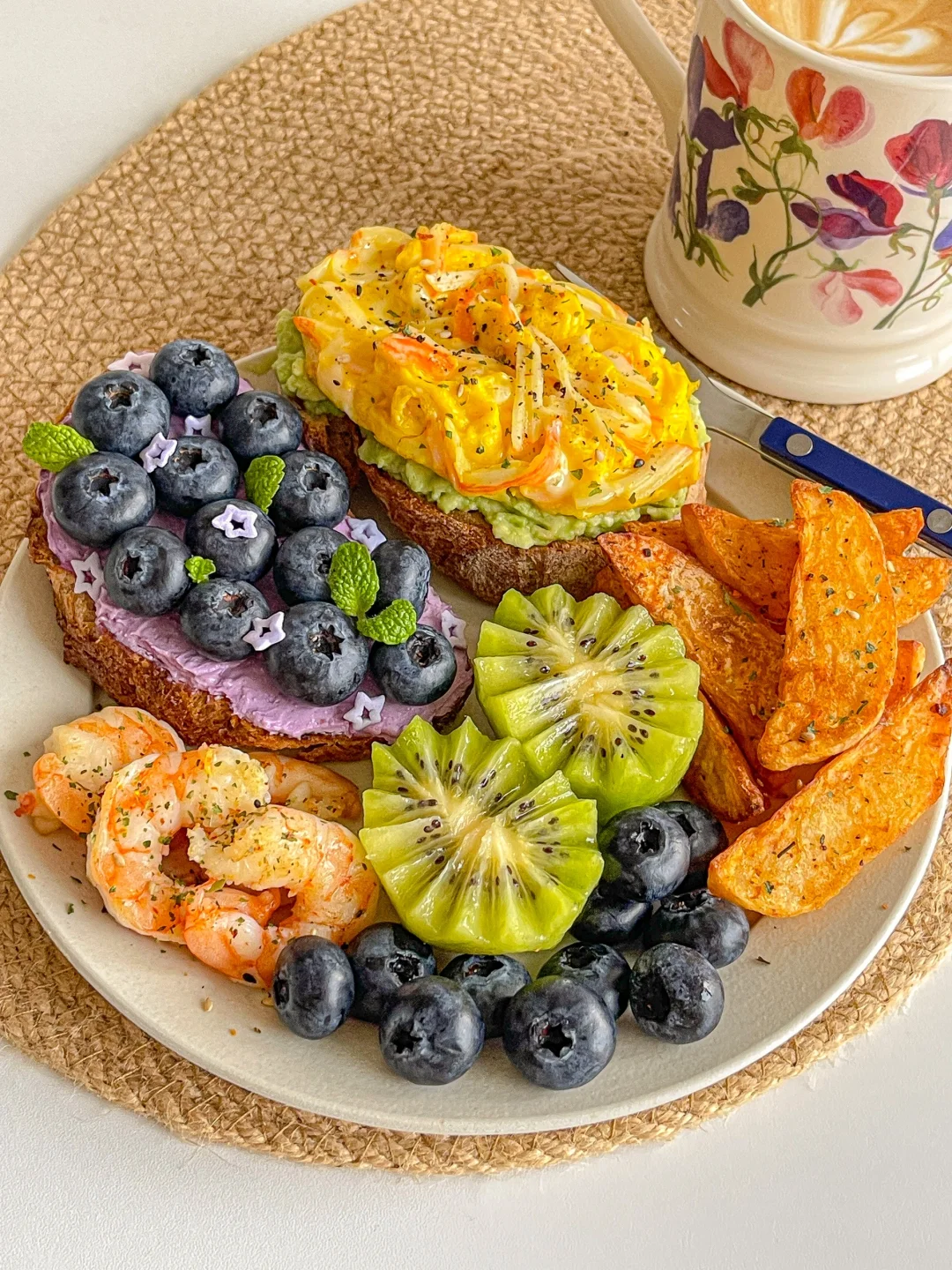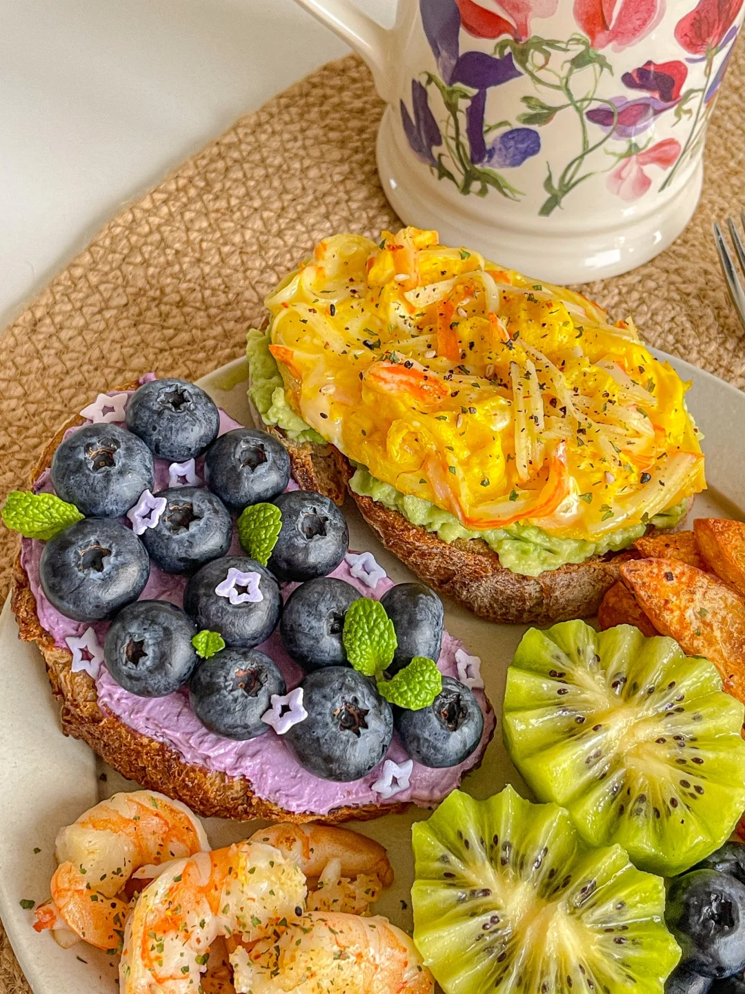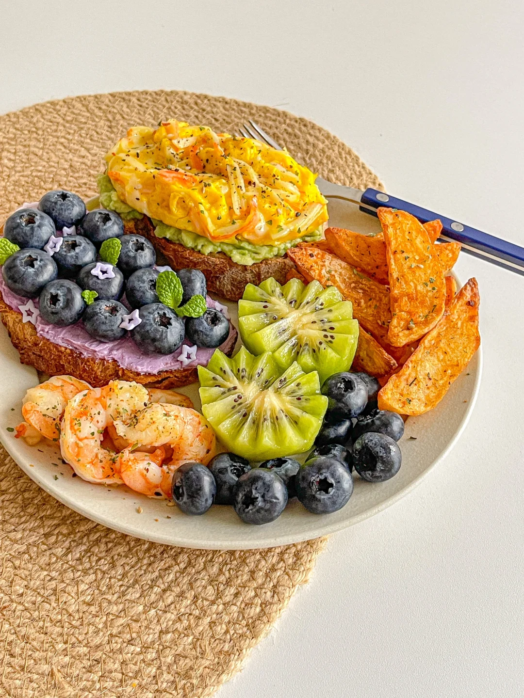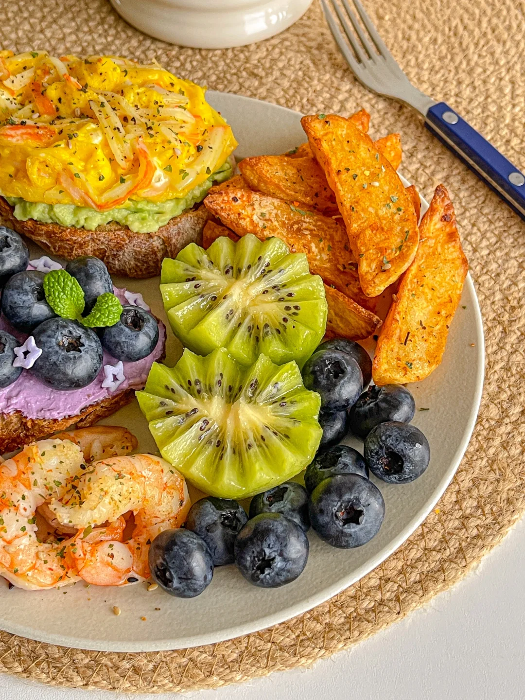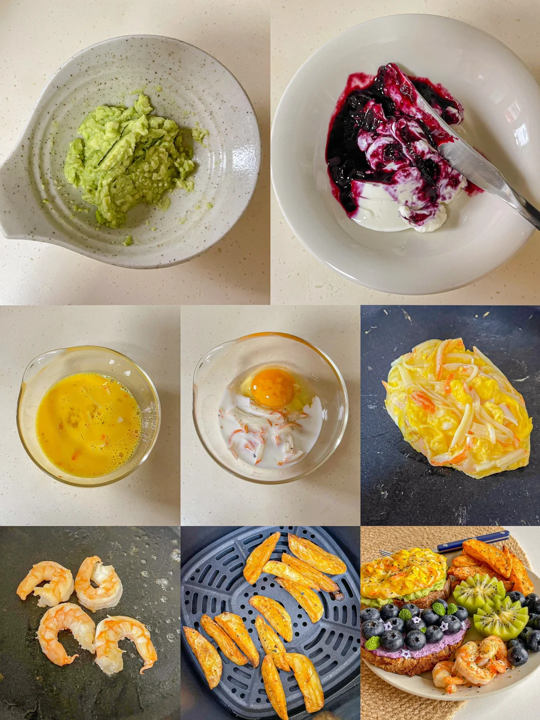 又幸福了 今天的早午餐拼盘都是爱吃的! 食材:🫐 欧包➕蓝莓酱➕奶酪➕蓝莓 欧包➕牛油果泥➕蟹柳滑蛋 烤薯角➕虾仁➕奇异果➕蓝莓 昨天那个蓝莓踩雷了 大又酸的蓝莓 🥹只能拿来熬蓝莓酱了!和奶酪混合涂抹在欧包上 酸酸甜甜的回味满满的奶香味!不会出错的吃法[偷笑R]