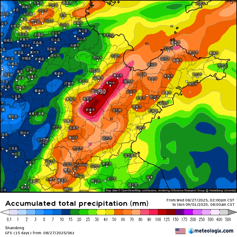 根据最新的气象资料分析,今天晚上开始北部地区天气变得不稳定起来,强对流天气逐渐发展并且有分散性暴雨。 此外,未来三天山东雷阵雨都会比较频繁,范围也将逐渐扩大。 其中,30-31日鲁东南、鲁中东部和半岛地区有大范围中到大雨或暴雨,东部地区累计降水量可达到50~150毫米。